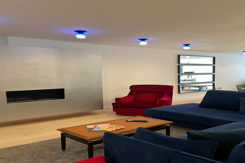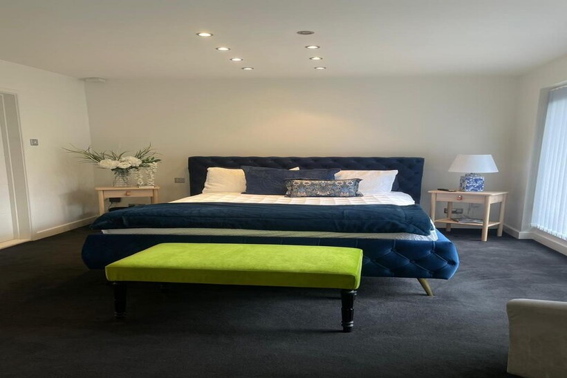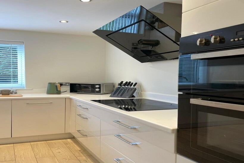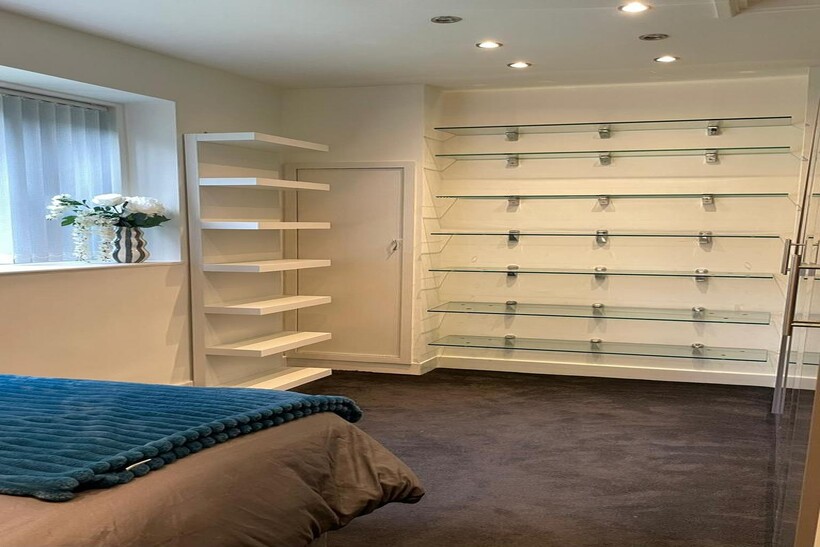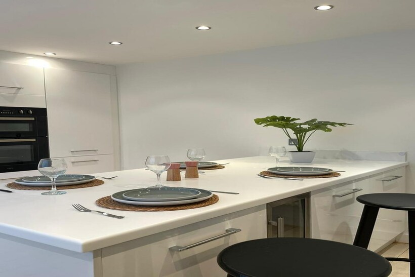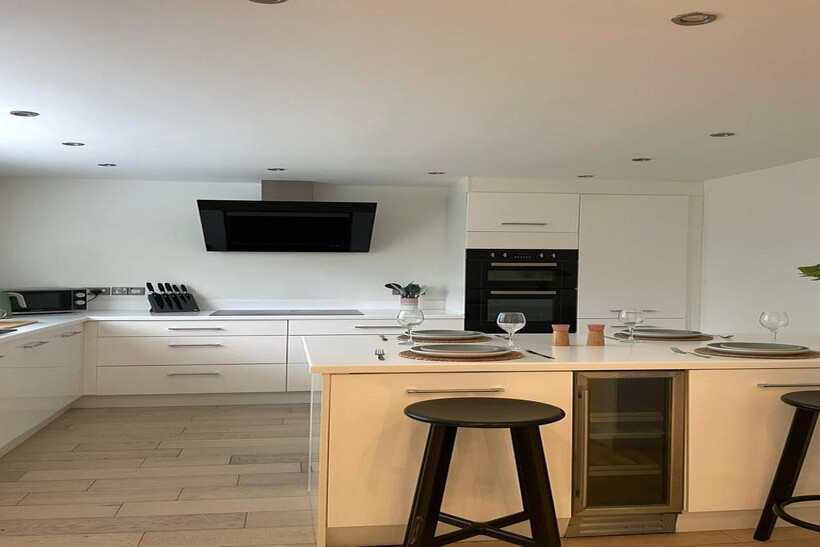 Interior-The entrance of the house is marked with double entrance doors which are also supported by a security shutter. In the reception hall stands the staircase leading to the lower reception areas and in the inner hall there is a well-equipped guest cloakroom and utility area. Defining the whole of the ground floor is the statement veneered wooden flooring, which is most prominently taken advantage of in the open plan lounge room. Comprising wiring for a wall-mounted TV and contemporary gas fireplace in one end of the room. In the same area there is a large number of seating spaces including a large rustic dining table and comfy, stylish sofas met with the double glazed patio doors. The fully-fitted kitchen blends modern minimalism with style, having white-gloss multi functional units and a matching breakfast island. The integrated appliances include an electric hob, a double electric oven, a dishwasher and a fridge-freezer.The first floor has a spacious double bedroom making up the principal suite and offers ceiling lighting, wiring for a wall-mounted TV and the main attraction being the superb breakfast balcony complete with glazed and brushed steel Balustrading. This principal suite has an ensuite bathroom with a double shower, toilet and twin wall hung sinks. The large second bedroom has ceiling lighting and is met by a sliding door leading to the landing then into the third bedroom which offers display shelving. The main bathroom has a panel bath under a shower head and also has a basin and WC.