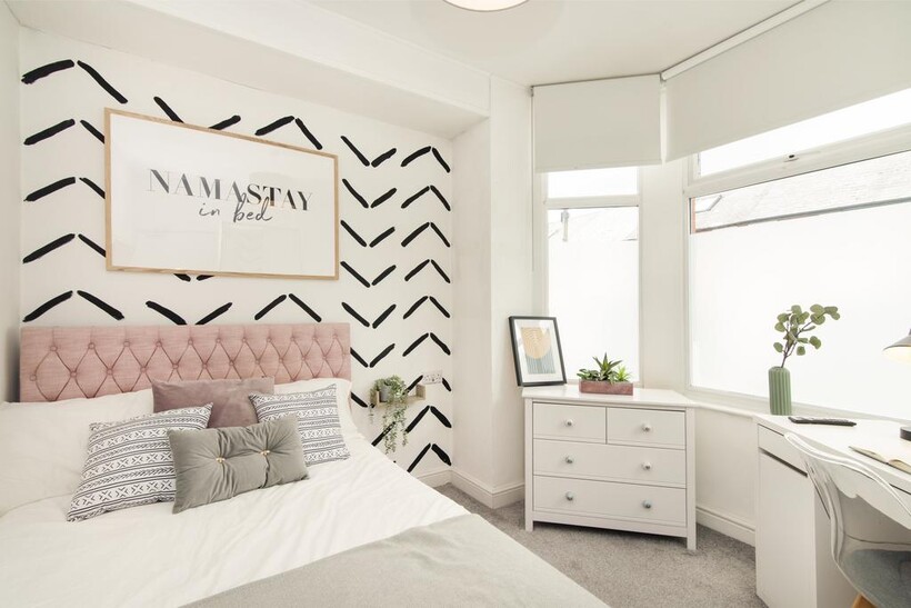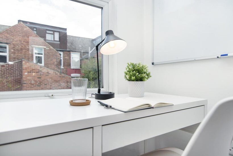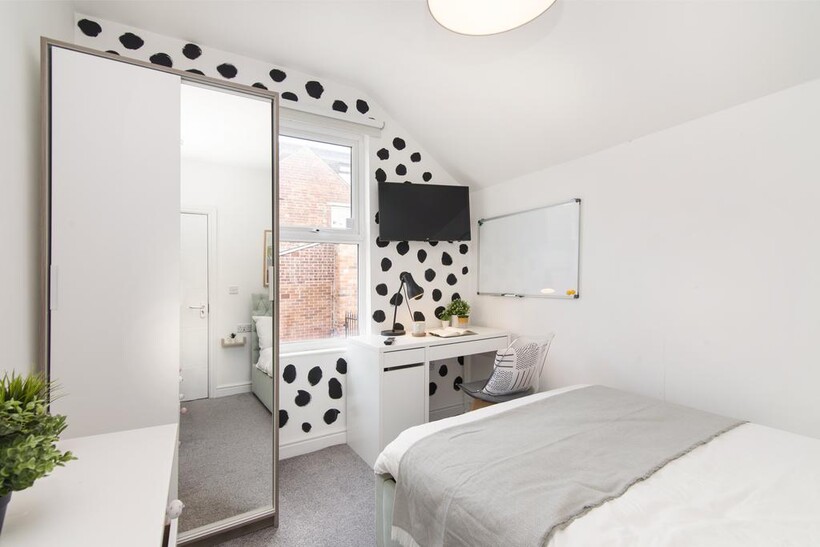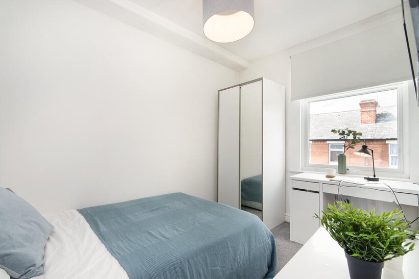This modern, 6-bedroom home comprises of 6 equally sized luxurious double bedrooms fitted with TVs, an open plan kitchen diner, a living room with a mounted TV, and 2 bathrooms. Each room has a desk, chest of drawers and wardrobe for ample storage whilst the kitchen is fitted with a electric cooker, oven and a fridge/freezer with plenty of storage available, as well as a small breakfast bar.