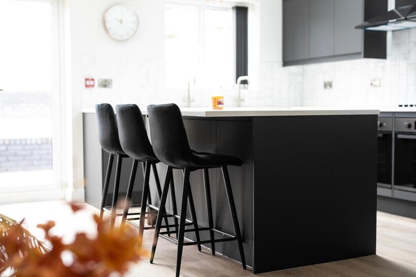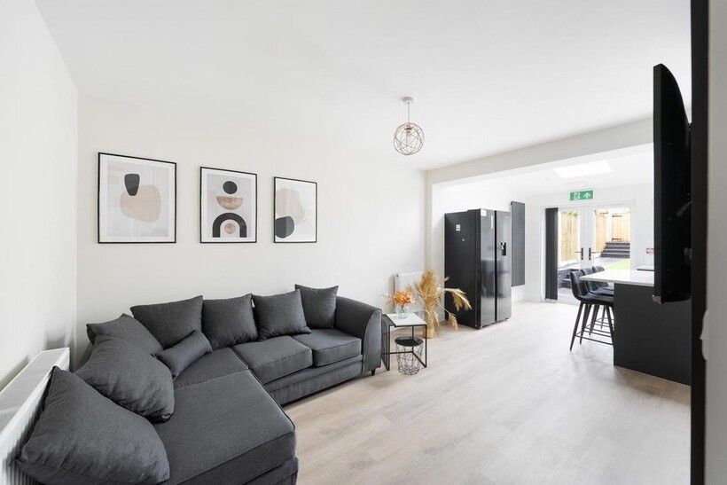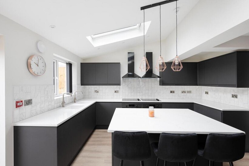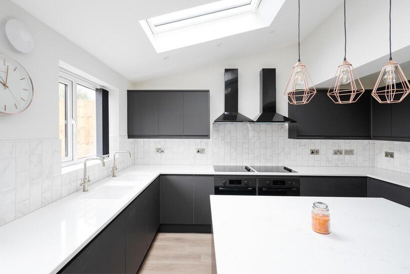 The property has been renovated to a high standard and features a large, open plan kitchen, living area. The kitchen comes with a breakfast bar and stools, flatscreen Smart TV and corner sofa. There is a fridge freezer, two ovens, hobs, cooker hoods and a dishwasher.