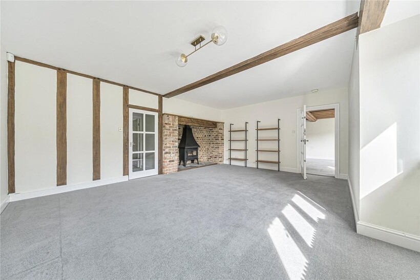 Double doors lead into a magnificent triple-aspect drawing room, awash with natural light and featuring a charming wood-burning stove and striking oak beams that add character and warmth to the space. Additional reception rooms include a cosy, front-facing sitting room and a bright, south-facing office or TV room, ideal for work or relaxation.