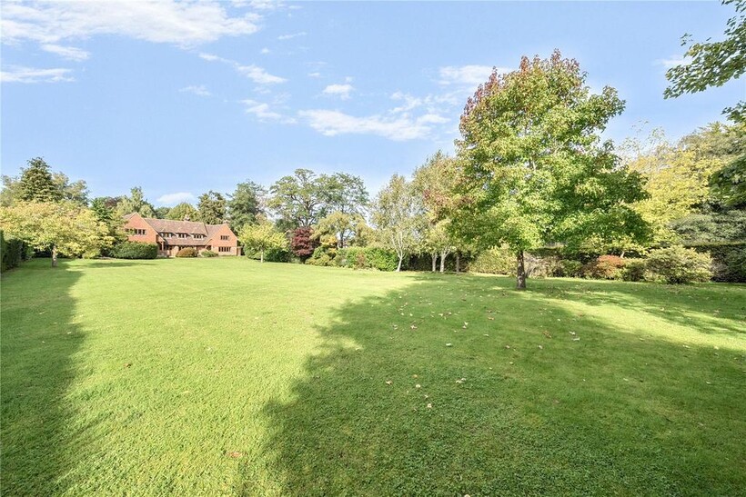 The expansive rear garden is predominantly laid to lush lawn, bordered by mature shrubs that provide privacy and a sense of natural serenity. A generous paved terrace creates the perfect space for outdoor entertaining or quiet reflection amidst the greenery.