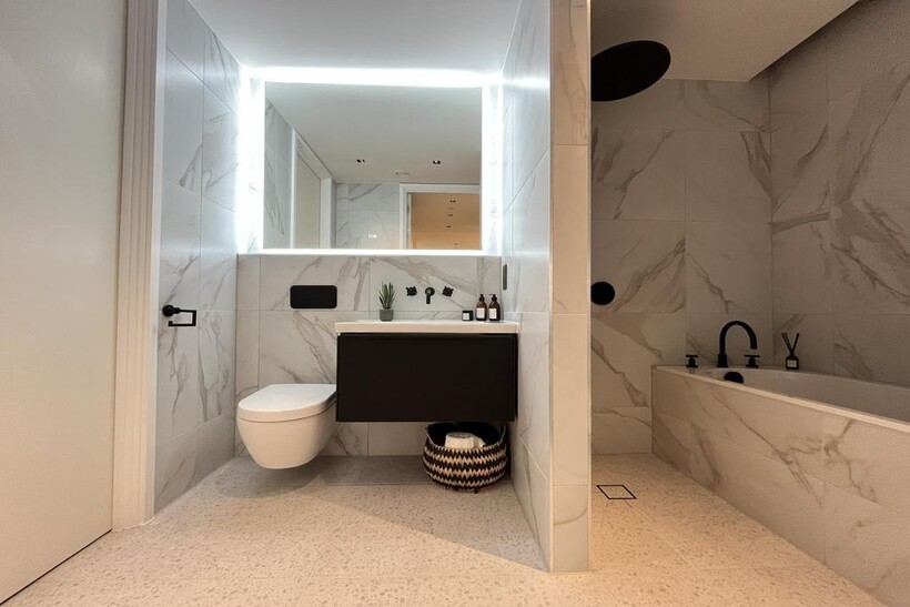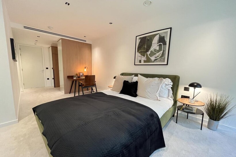 The apartment offers a bright open-plan reception and dining area, complemented by large windows that invite natural light. The modern kitchen is fitted with high-spec integrated appliances. The double bedroom comes with fitted wardrobes, while the bathroom showcases a chic, modern design with luxury fittings.