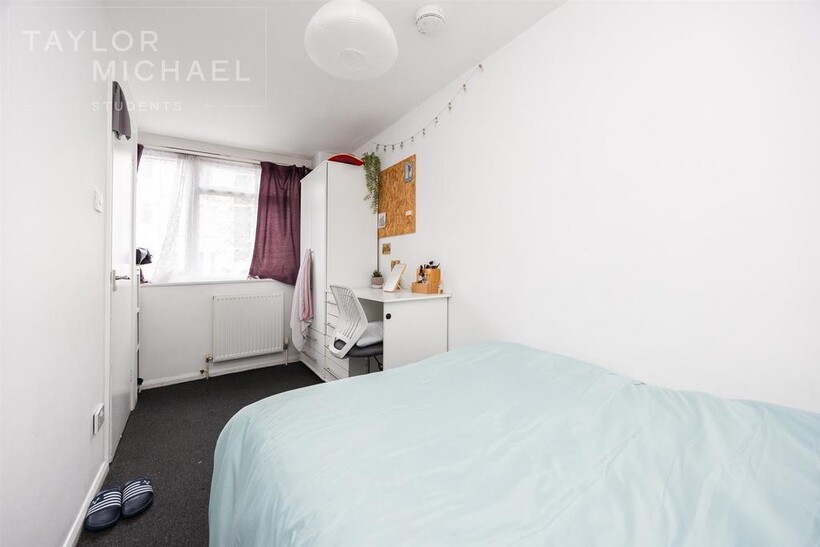 The property features five generously sized bedrooms, all fully furnished with a bed, desk, chair, wardrobe, and storage options to create a comfortable and functional living space. Each room has been thoughtfully designed to meet the needs of students, offering privacy and ample space for study and relaxation. The bright, airy atmosphere throughout the house ensures a welcoming environment, with large windows allowing natural light to flow through the rooms.