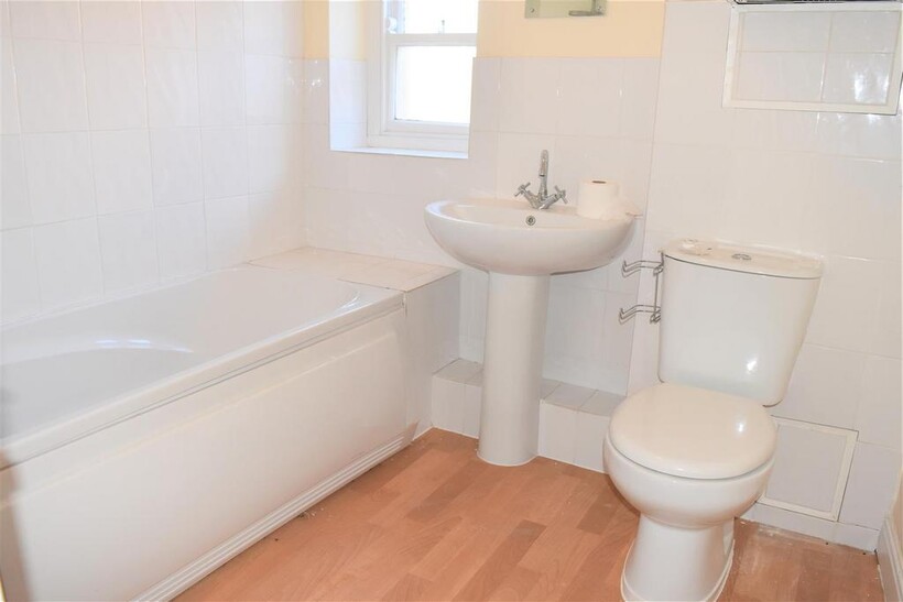 Bathroom - 2.18m x 2.03m (7'2" x 6'8") - White suite comprising: Panelled bath with over head mains shower, low level W.C., pedestal hand wash basin and taps, chrome heated towel radiator, wall mounted boiler, extractor fan, wooden sash window to rear aspect.