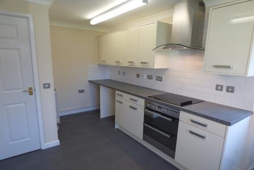 Entry to property via front door into hallway with carpeted flooring, leading to a stylish kitchen with extensive cupboards and light grey tiled flooring, electric hob and cooker, space for tall boy fridge/freezer and plumbing for dish washer.