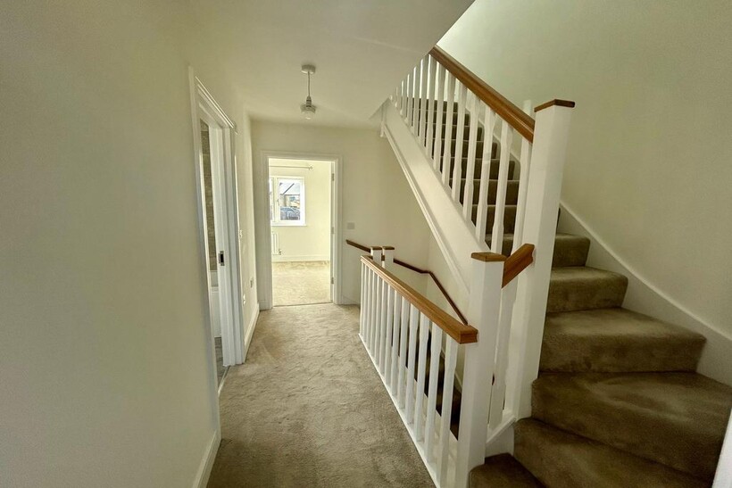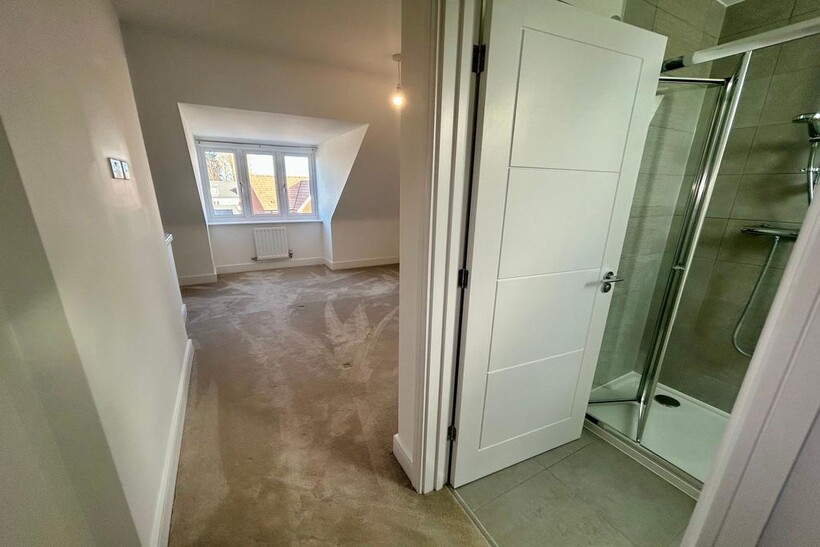 The second floor is dedicated to the luxurious primary suite, offering a private and tranquil retreat. With its own private hallway, complete with a Velux window, the expansive room includes a built-in, lit storage cupboard and a beautifully presented en-suite.