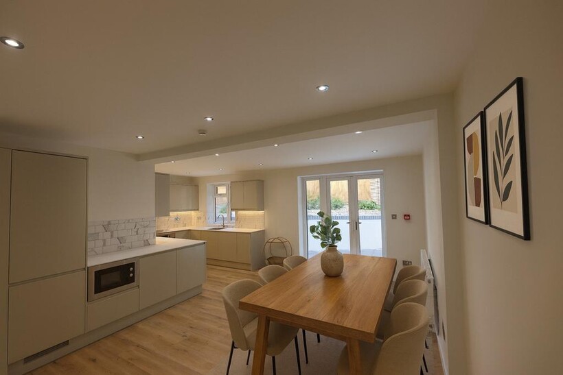 High-Spec Kitchen: The kitchen features contemporary acrylic worktops, integrated appliances including a microwave oven, and ample cabinetry—perfect for both casual meals and entertaining.