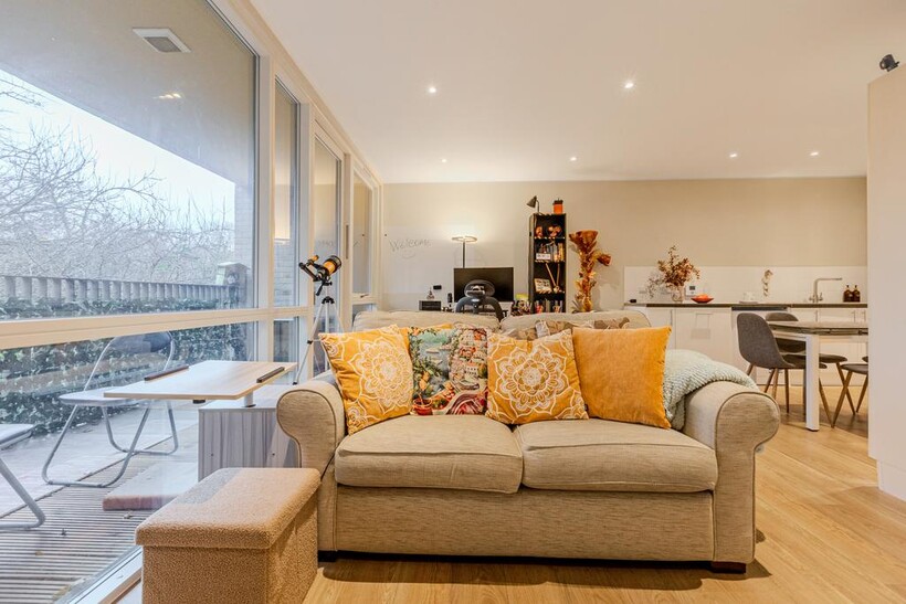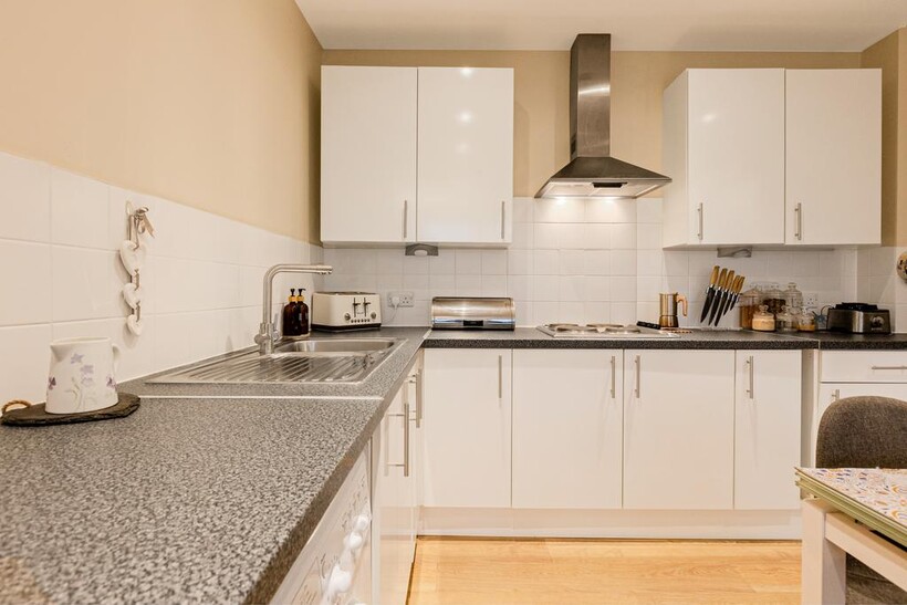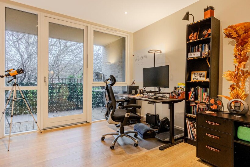 Inside, you’ll find a bright and airy open-plan living area with a comfortable sofa and a designated work desk, ideal for remote working or planning your day. The dining area is perfect for cosy meals at home, while the private balcony offers a peaceful spot to enjoy a morning coffee or evening drink. The fully equipped kitchen comes with modern appliances, including an electric hob, making it easy to cook and dine in. The flat features a cosy office corner equipped with a whiteboard, second monitor, ergonomic office chair, and electric des, perfect for professionals, writers, or anyone seeking a quiet, productive space.