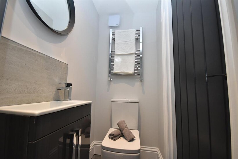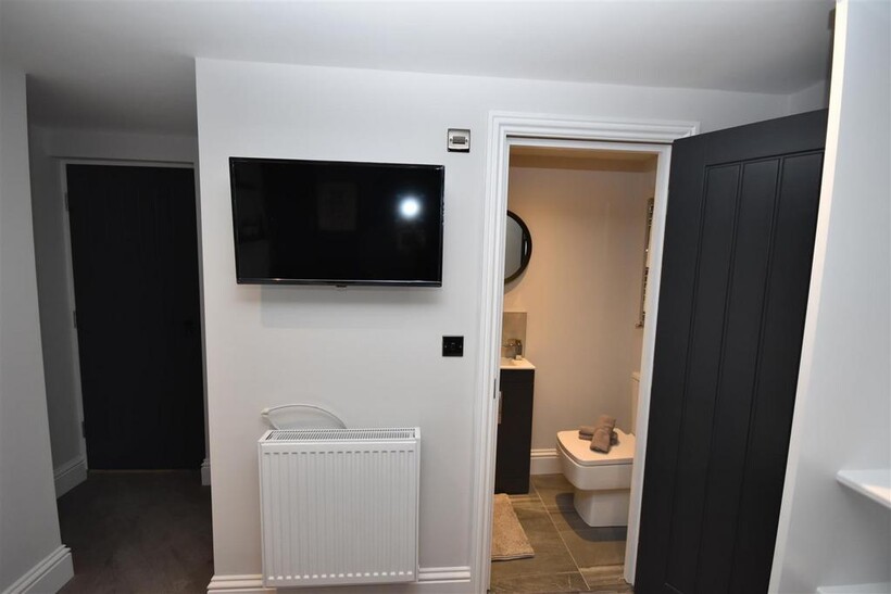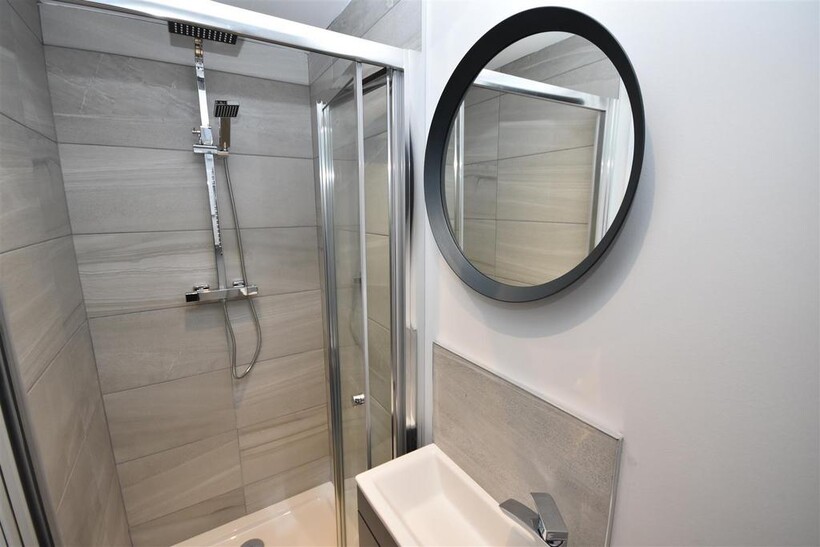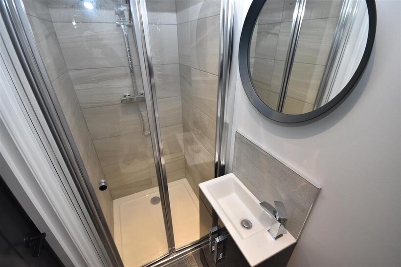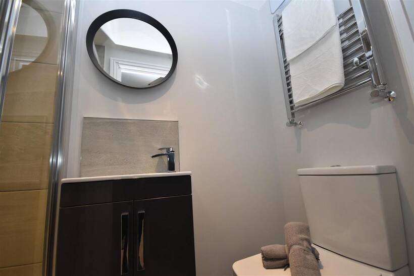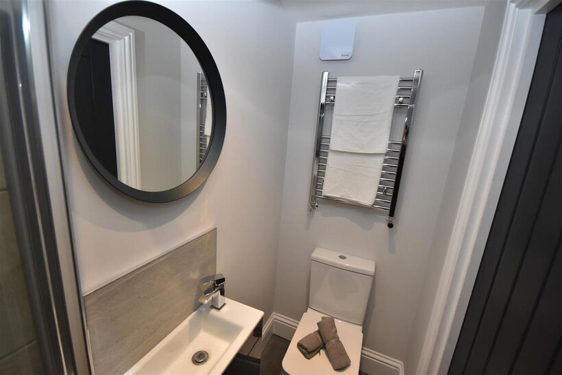 En-Suite - Shower cubicle with thermostatic shower, WC, wash basin vanity unit with mixer tap, heated chrome towel rail, low noise extractor fan, partially tiled walls.