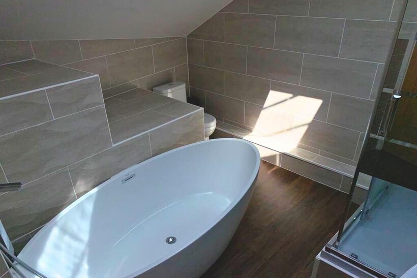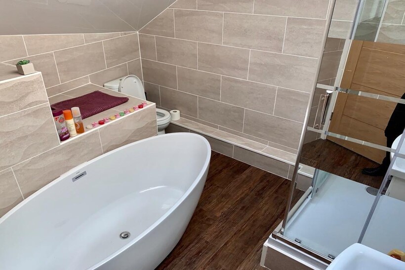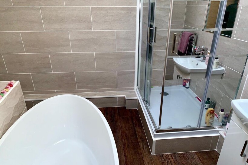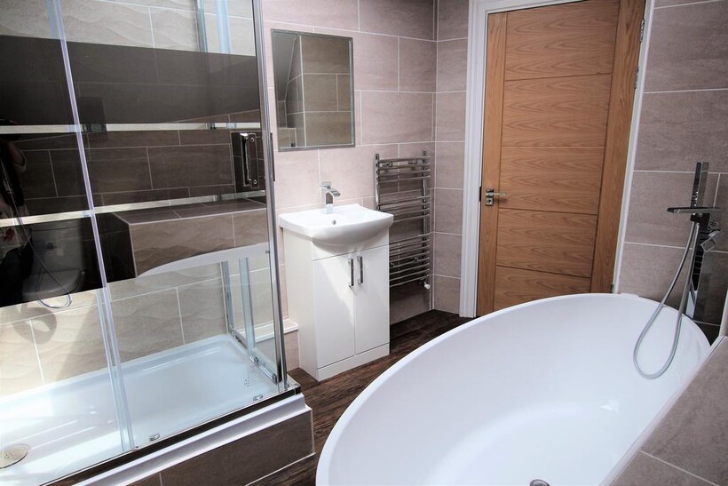 The large bathroom features a gorgeous oval bath and separate shower cubicle.