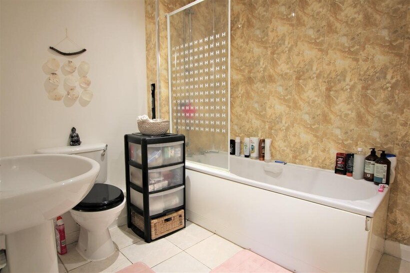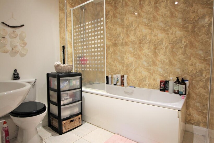Tiled bathroom with shower over bath