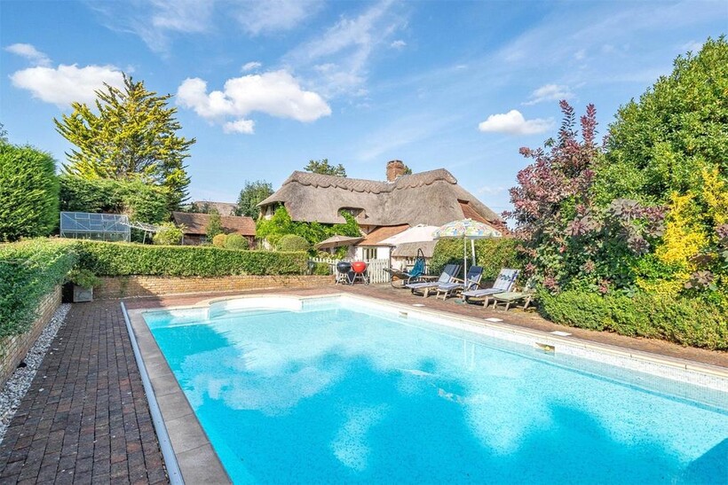 Further steps lead to the heated swimming pool with an electronic cover, inset into a brick and paved terrace. In this area is a timber outbuilding which houses the pool plant equipment and heat exchanger.