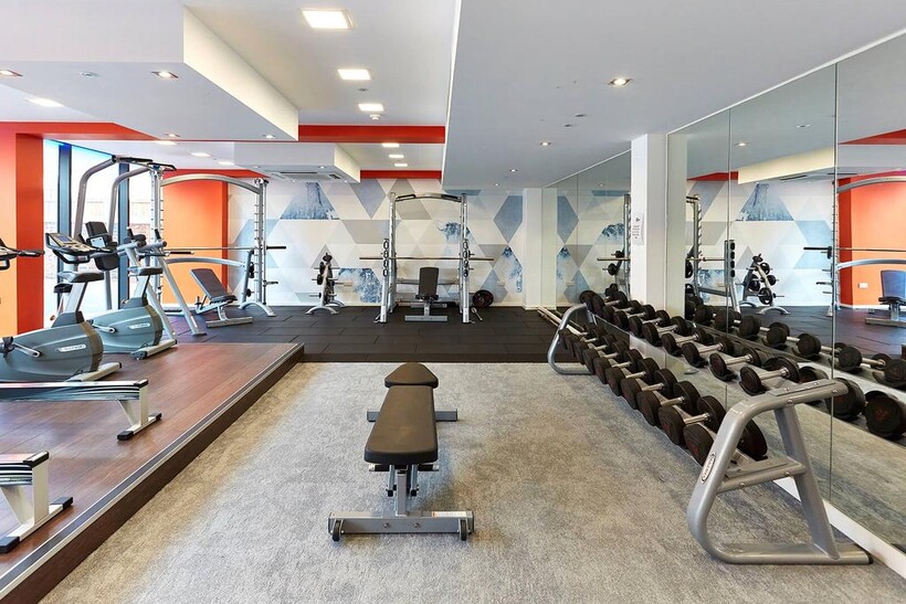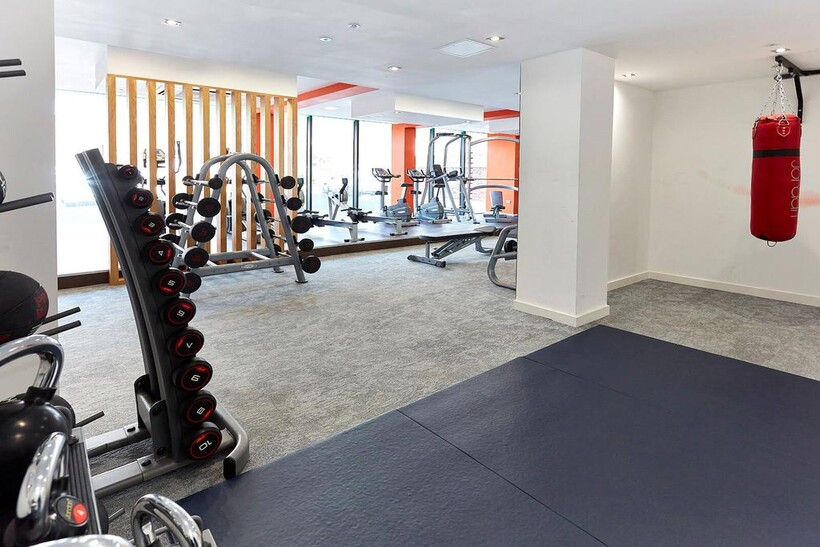 The separate open-plan living and kitchen area is fitted with high-spec appliances, including an oven and hob, washer-dryer, and an integrated fridge with freezer compartment. A comfortable sofa and smart TV create the perfect space to unwind, with plenty of storage throughout the apartment.