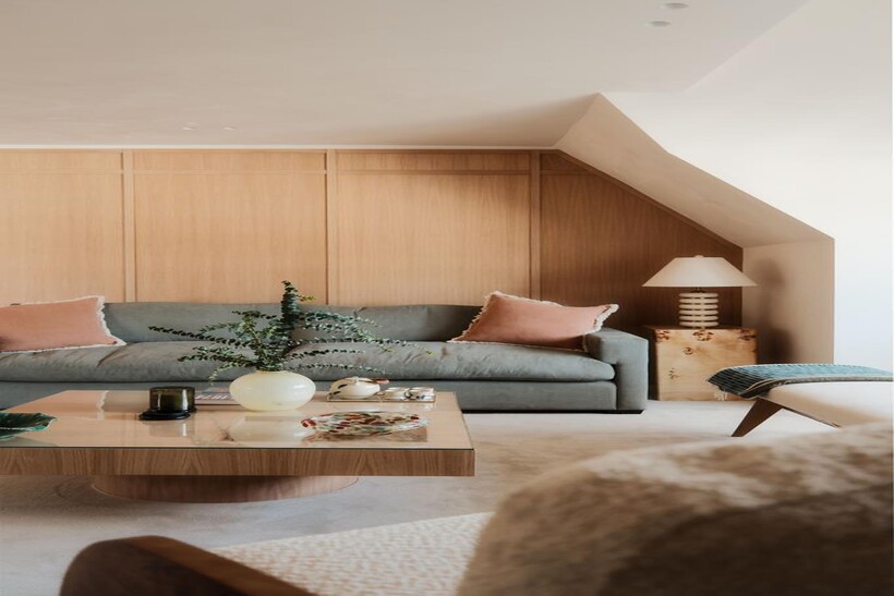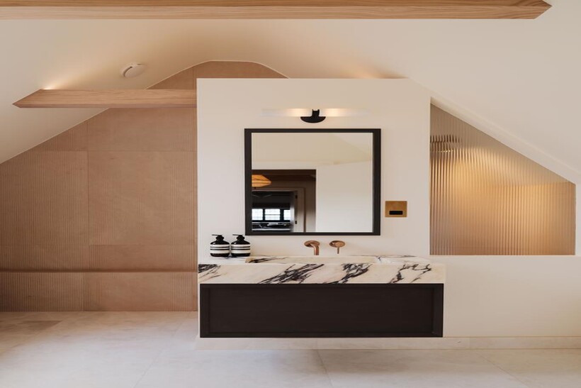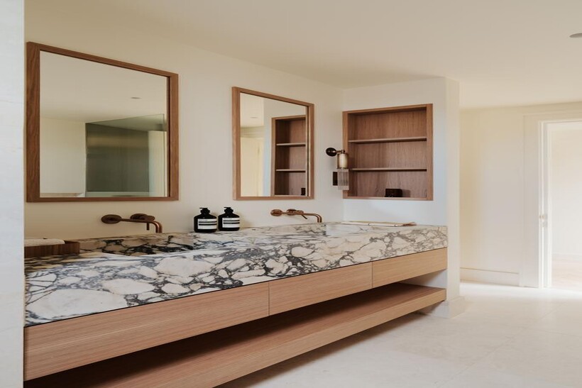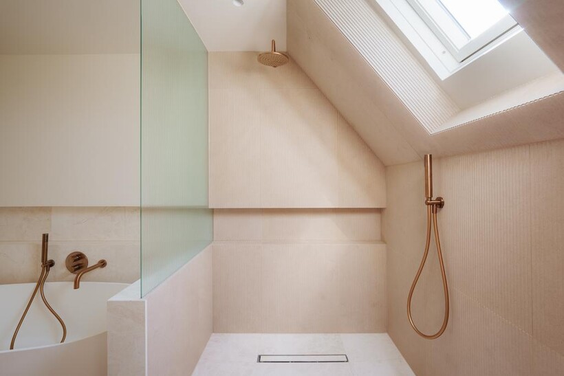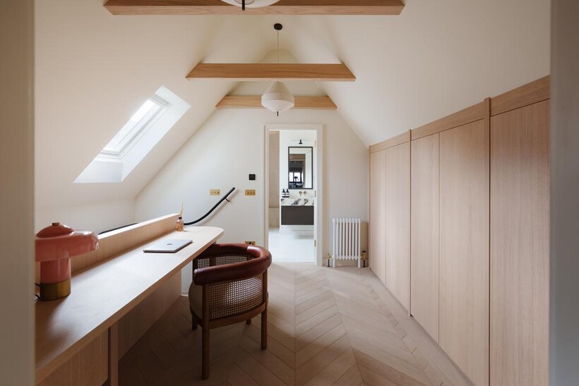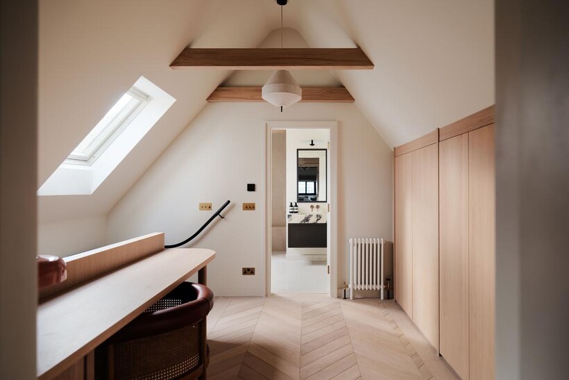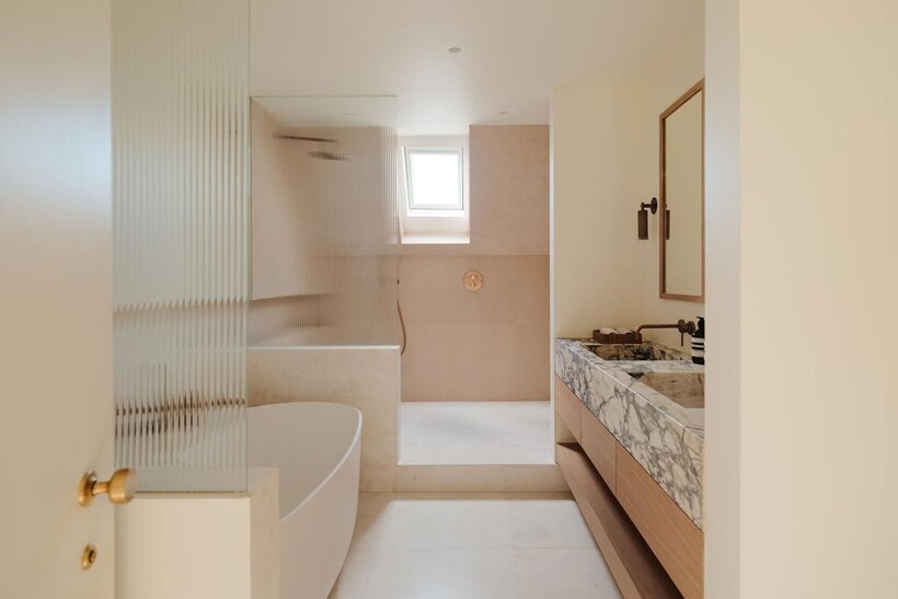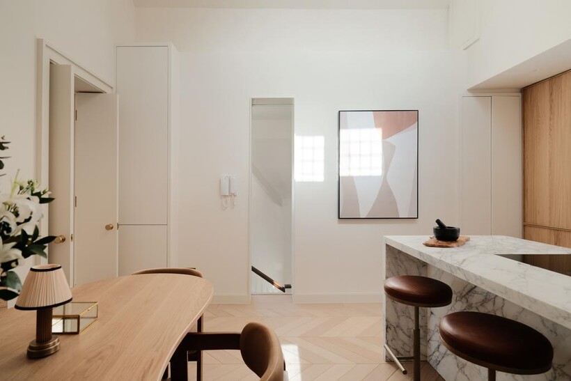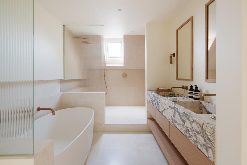 The fourth floor hosts the principal bedroom suite, complete with a king-size bed, extensive fitted wardrobes, and a luxurious marble-finished en-suite bathroom with both bathtub and walk-in shower. A second spacious double bedroom and an additional bathroom are also located on this level, alongside a versatile study or dressing room; ideal for remote working or additional storage.