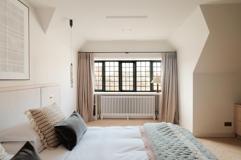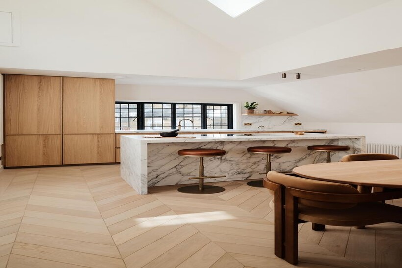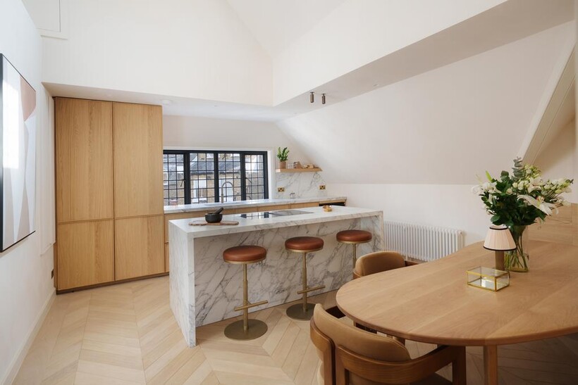 The third floor features a spectacular open-plan reception space, with striking proportions, dual-aspect windows, and a feature fireplace. A dedicated dining area flows seamlessly into the bespoke kitchen, which is fitted with high-quality integrated appliances including a full-size fridge/freezer, wine fridge, electric oven and hob. A separate utility room provides additional practicality, housing both a washing machine and tumble dryer.