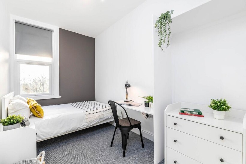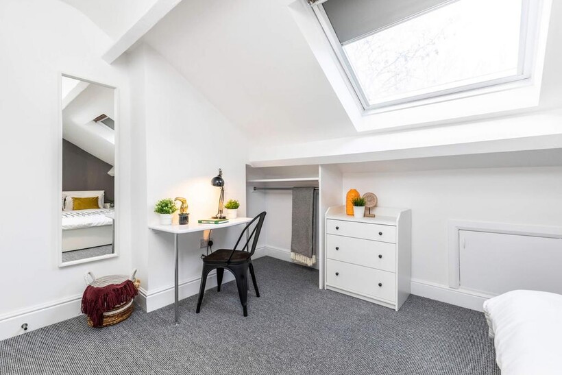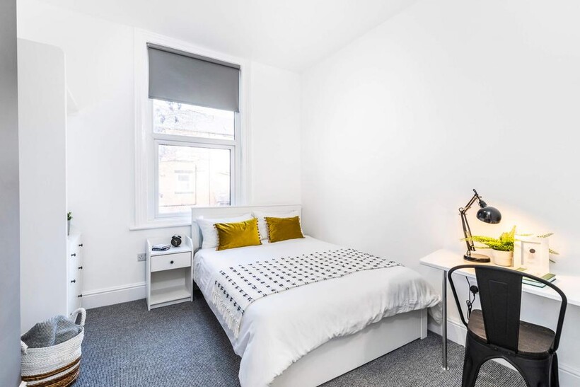 • 6 large double bedrooms, fully furnished with everything you need: double bed, wardrobe, chest of drawers, bedside table, full-length mirror, desk, and chair - ideal for both study and relaxation.
