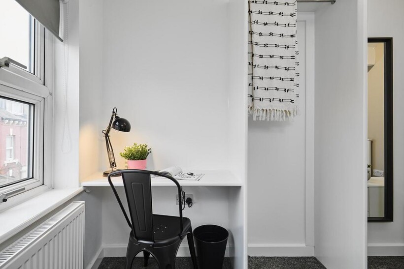 • 4 large double bedrooms, fully furnished with everything you need: double bed, wardrobe, chest of drawers, bedside table, full-length mirror, desk, and chair - ideal for both study and relaxation.