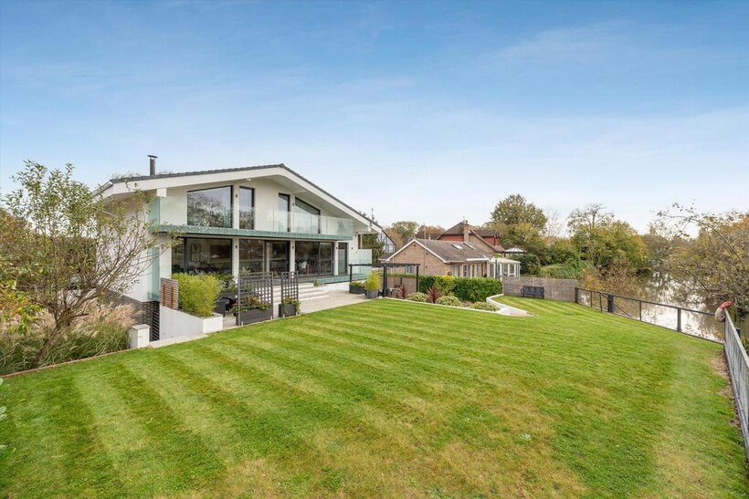 Outside, the property enjoys a beautifully landscaped waterside garden with retractable covered pergola, ample driveway parking, a large undercroft (2–3 cars or storage).