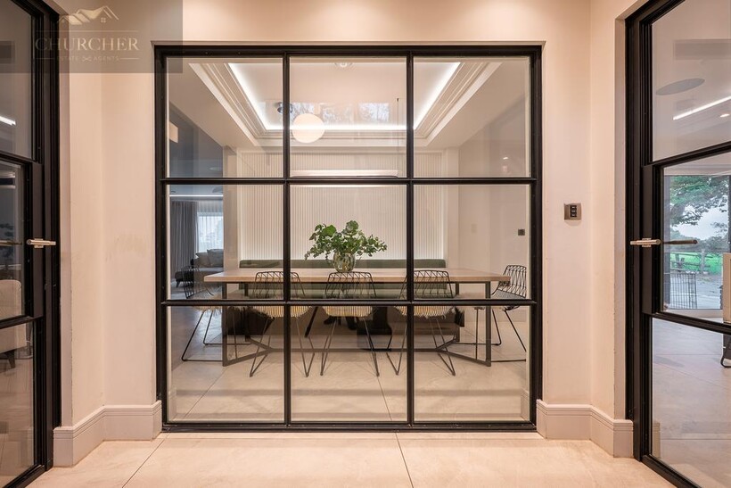 Designed for both entertaining and unwinding, the home flows effortlessly through luxurious, light-filled living spaces. The property opens into a striking reception hall, setting the tone for the elegance that continues throughout. Crittall Glass-panelled partitions and mirrored detailing flood the space with light, while soft neutral tones and contemporary finishes create a calm and welcoming first impression. To one side, the formal dining area sits beautifully framed behind glass double doors, a chic, social space with built-in banquette seating and ambient lighting, perfect for intimate dinners or lively entertaining.