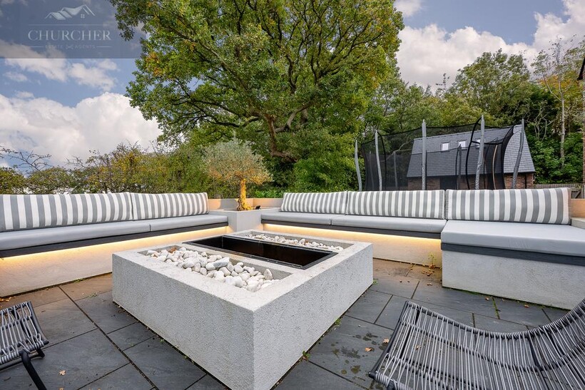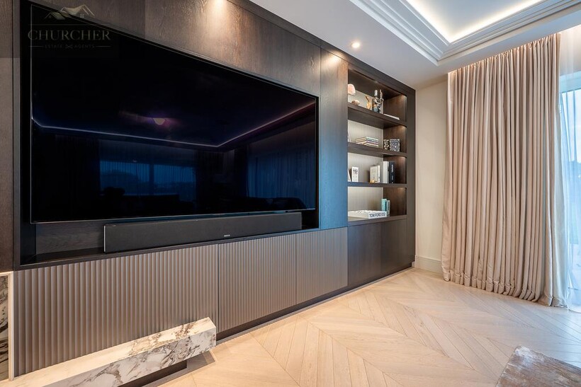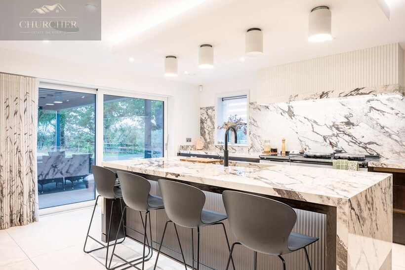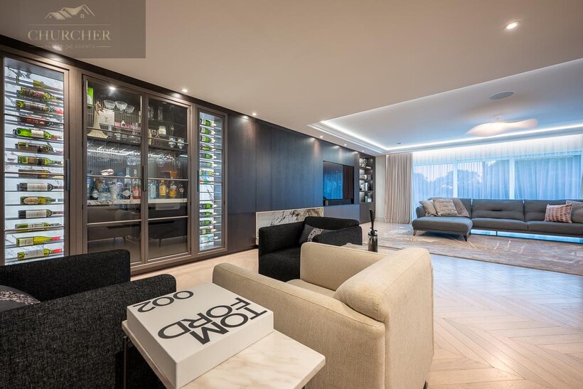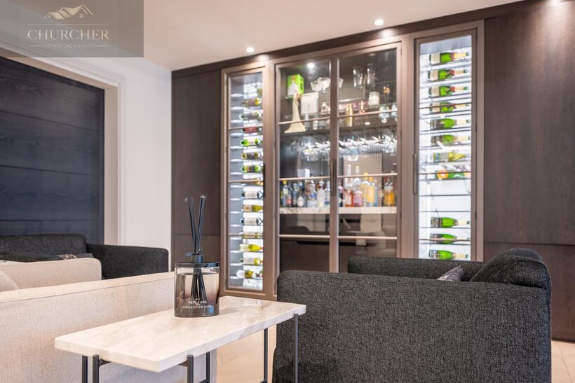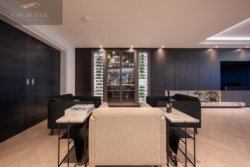 The main lounge exudes understated luxury, with soft neutral tones, ambient ceiling lighting, and panoramic glazing that frames sweeping garden and countryside views. A bespoke media wall and contemporary furnishings create a calm yet refined environment, ideal for relaxed evenings with friends or family. Perfect for both entertaining and unwinding, the lounge is complemented by an elegant bar area, complete with glass-fronted cabinetry, dual wine storage, and marble accents. Whether hosting evening drinks after a day at the golf or enjoying quiet conversation by candlelight, this space defines modern country elegance.