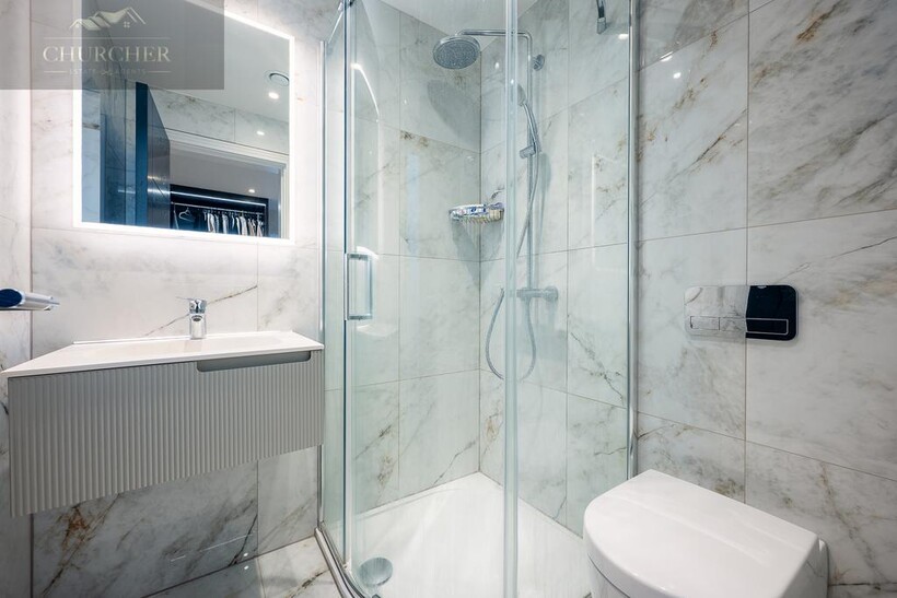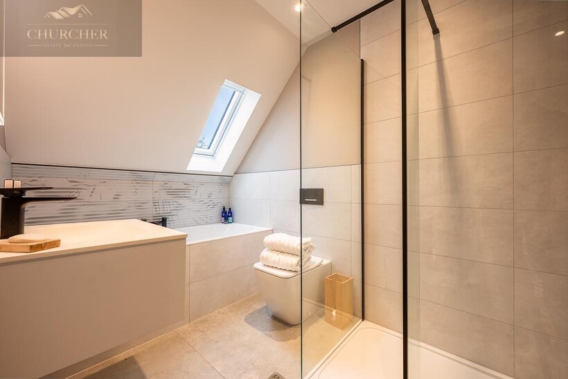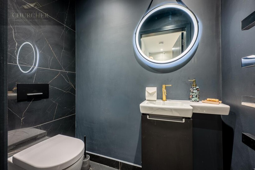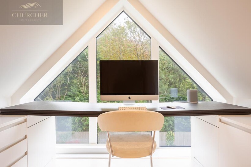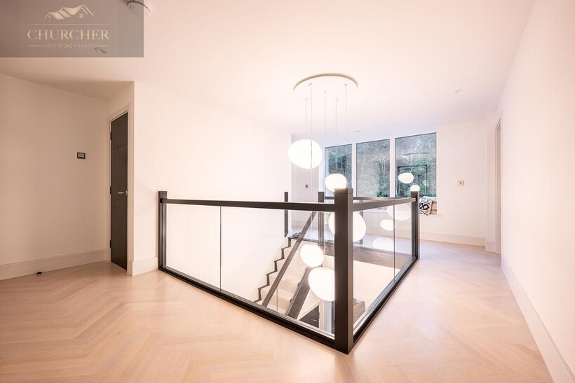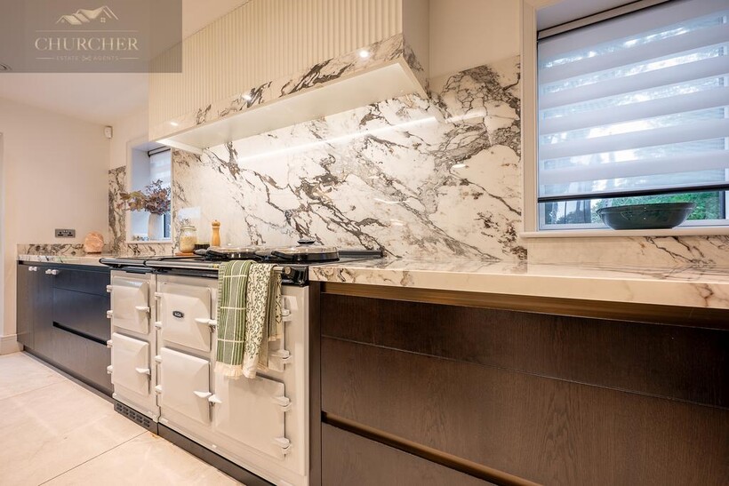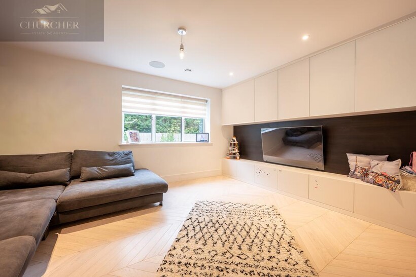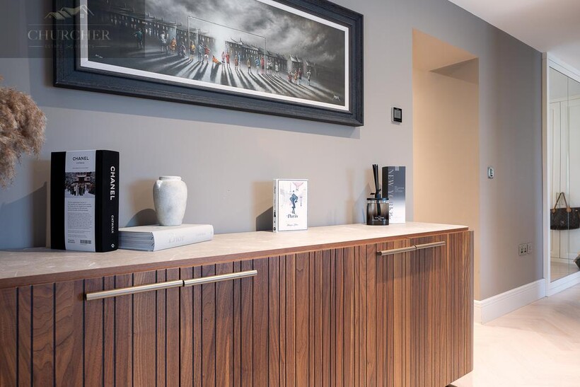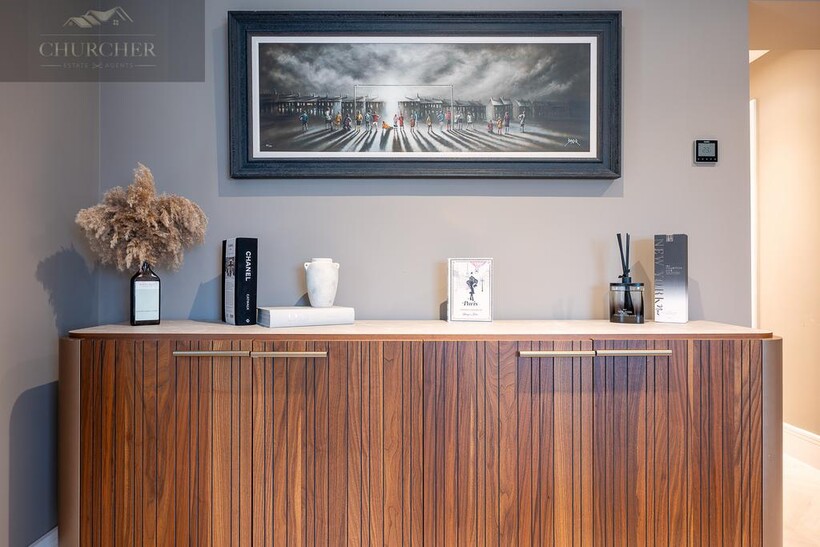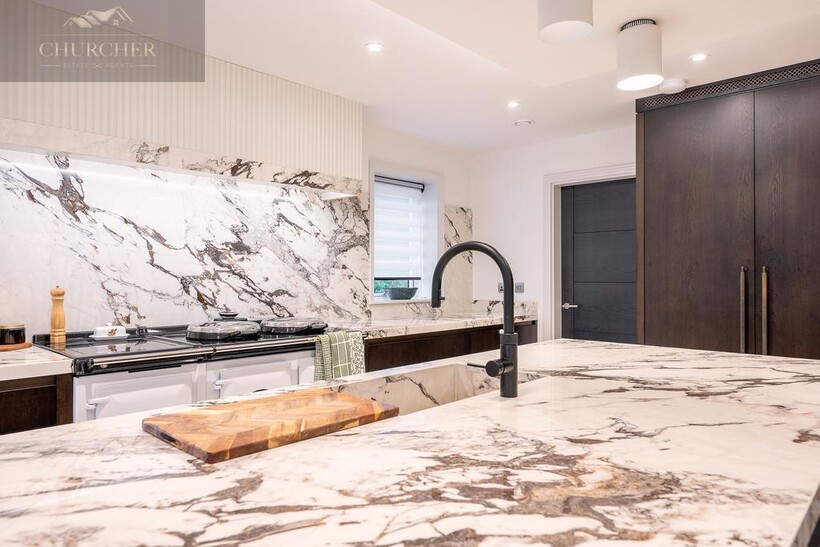 The open-plan kitchen and living area forms the true heart of the home - a striking social hub designed with the entertainer in mind. The sleek, handcrafted kitchen by Hetherington Newman features marble-effect surfaces, a large central island, and a statement AGA, perfectly complemented by a stylish dining area and glass doors that open directly onto the garden terrace. It's the ultimate space for hosting pre- or post-tournament gatherings, private dining, or informal breakfasts before heading to the course. Completing the ground floor is a stylish WC and a well-appointed utility room with external access.