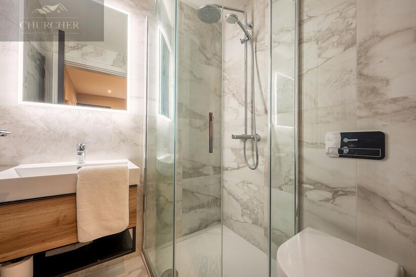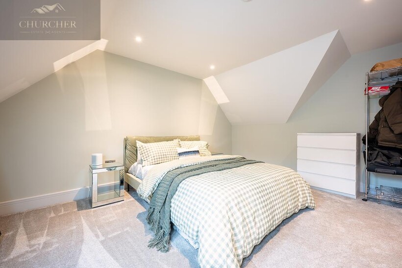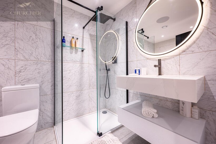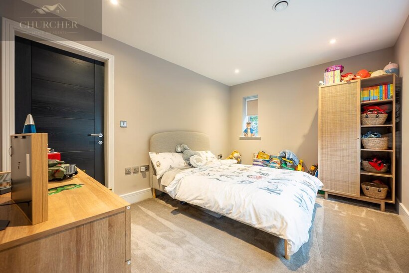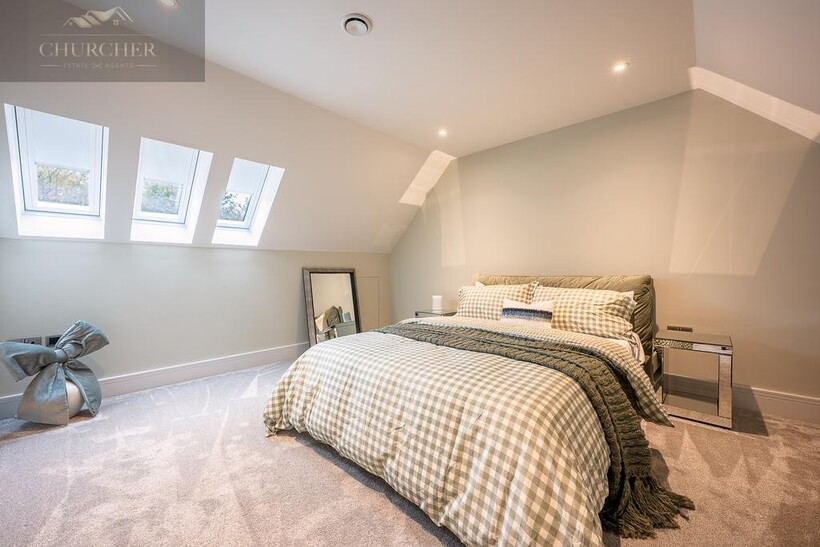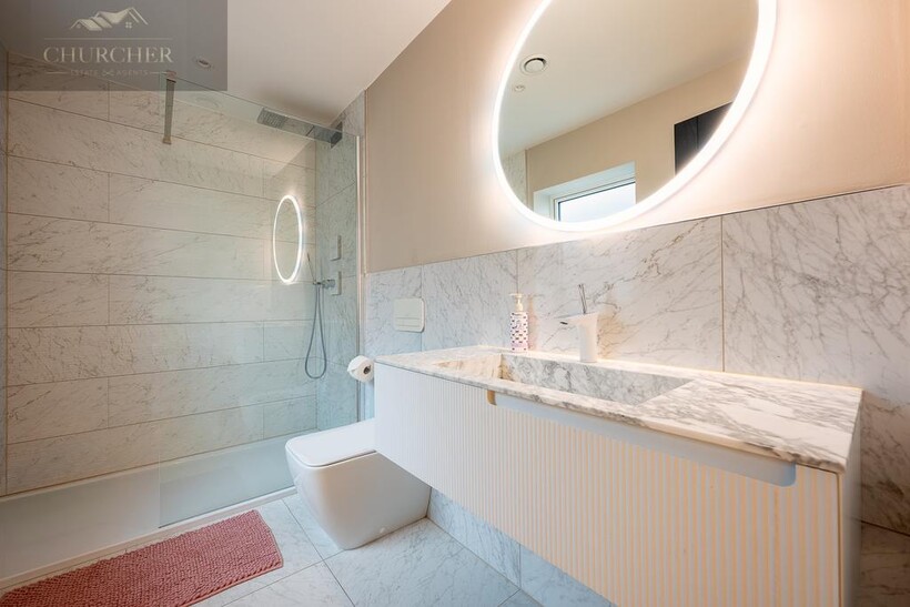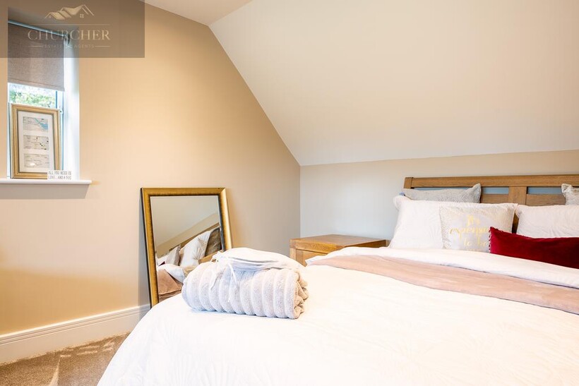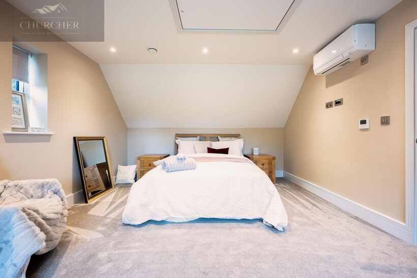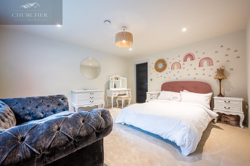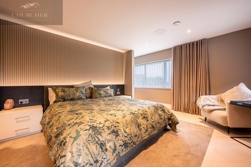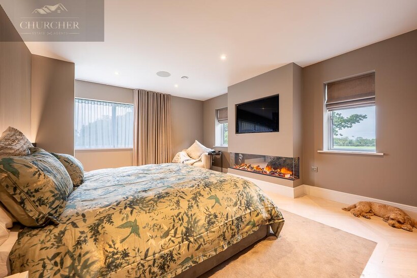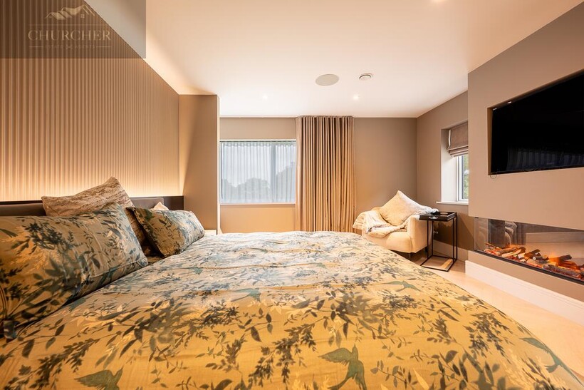 Ascending to the first floor, the sense of indulgence deepens. The main bedroom is a serene sanctuary, thoughtfully positioned to capture sweeping countryside views through large picture windows that fill the space with soft morning light. This beautiful bedroom combines warmth and modern elegance, with muted tones, layered textures and ambient lighting creating an atmosphere of calm sophistication. A statement feature fireplace sits beneath a wall-mounted television, adding both comfort and contemporary style - the perfect spot to unwind after a day at the course, glass in hand, while the sun sets over the fields beyond.