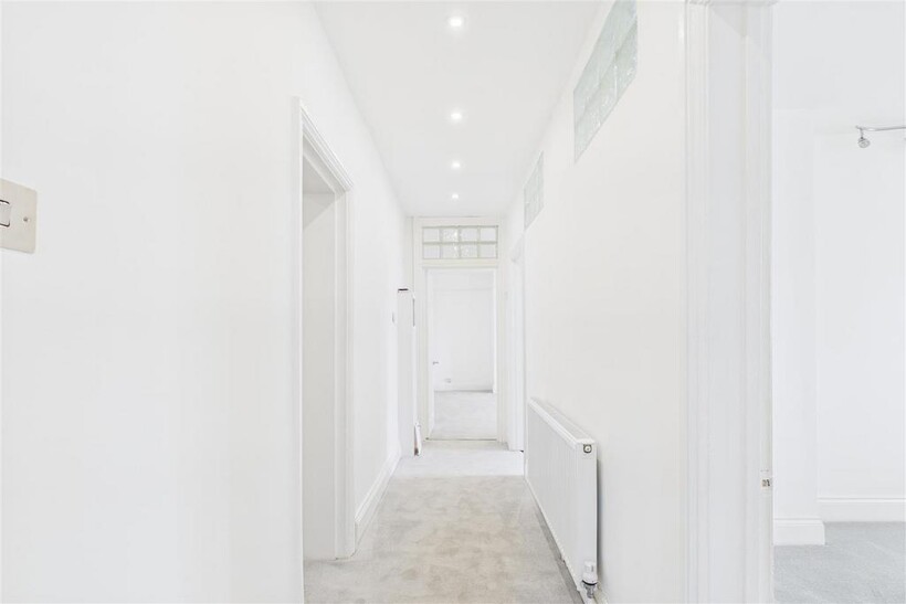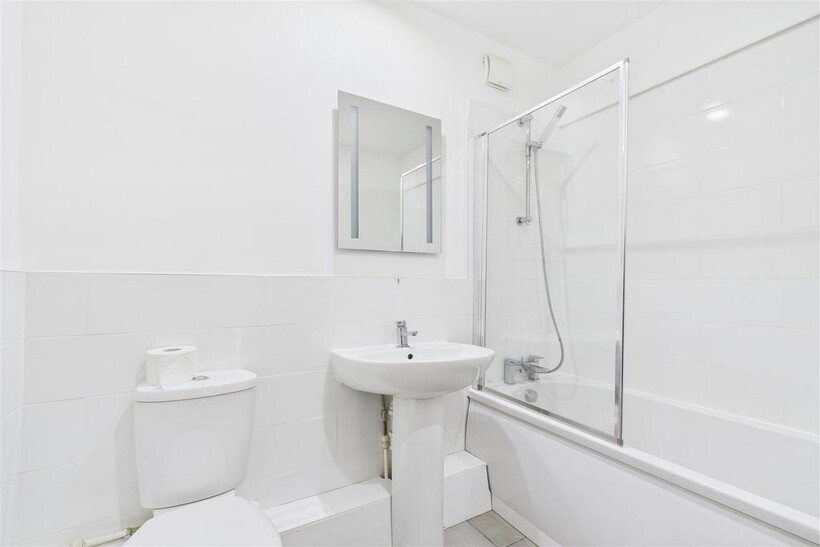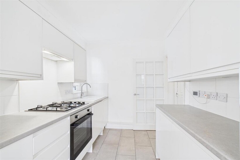 The accommodation is arranged across the lower ground floor and briefly comprises a spacious living room overlooking the rear of the property, a modern kitchen dining room fitted with a new gloss handless kitchen, and a new contemporary bathroom with a shower over the bath. There are two bedrooms, one generous double with built-in wardrobes and a smaller double.