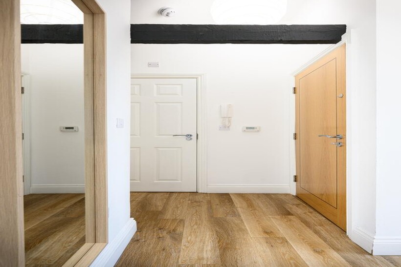 The apartment comes fully furnished and features sleek laminate flooring throughout. The modern kitchen is fitted with high-spec units and essential integrated appliances, while the contemporary shower room/W.C. adds a touch of luxury.