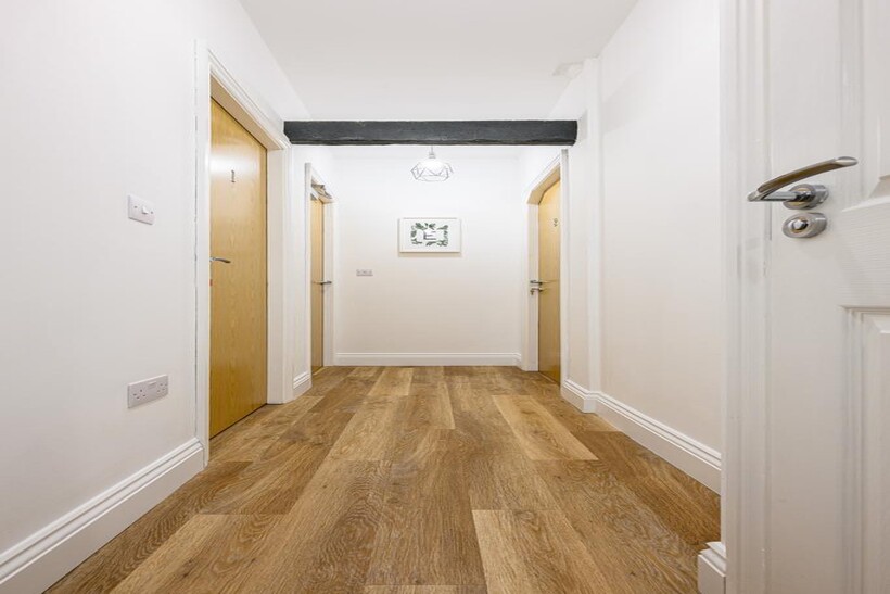The apartment comes fully furnished, featuring sleek laminate flooring throughout and a bright open-plan living space. The kitchen is fitted with high-spec units and integrated appliances, while both bathrooms are modern and stylishly finished, offering added comfort and convenience.