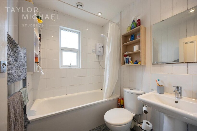 The kitchen is well-equipped with essential appliances, including an oven and hob, fridge freezer, washing machine, and plenty of cupboard space for shared use. A clean and functional bathroom serves the property, alongside a separate WC – offering added convenience for busy mornings and group living.
