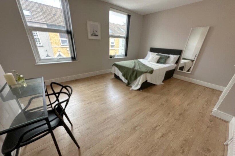 - Four bedrooms, each furnished with a double bed, desk, and ample storage