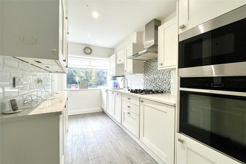 The modern kitchen has been tastefully refurbished with white cabinetry, high-quality fittings, and ample worktop space, offering both style and functionality. Upstairs, there are three bedrooms – two generous doubles and a well-sized single – all finished in neutral tones with modern flooring throughout. The contemporary shower room features a sleek suite with a walk-in shower, designed for convenience and comfort.