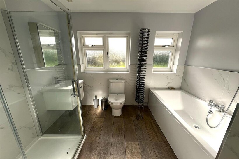 Bathroom - Fitted with low flush WC and wash hand basin with vanity drawer below. Bath with mixer tap and shower attachment over and separate good size fully tiled shower cubicle with controls and rainfall style shower head. Corkscrew style heated towel rail. Mirror fronted medicine cabinet and extractor fan. Under floor heating. Door giving access to Airing Cupboard with partially slatted shelves and heating controls.