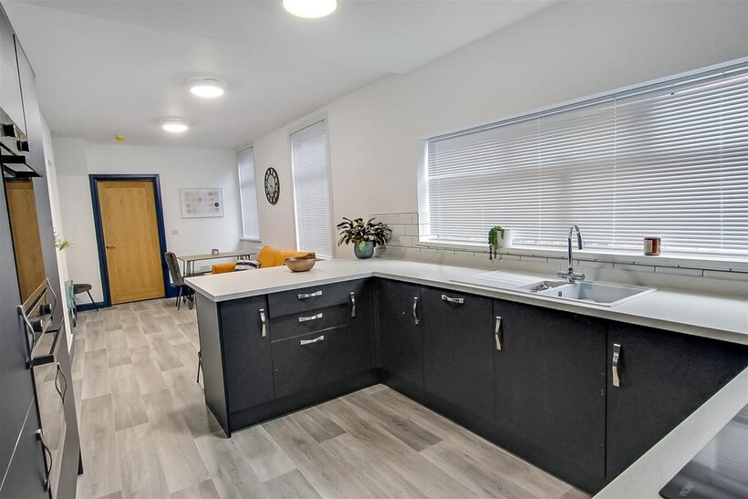 The shared open plan living, dining and kitchen with breakfast bar is the perfect space for those who love to cook or bake with great worktop space, two ovens, five-point hob and two fridge freezers plus plenty of storage space. The seating and dining area, complete with large wall mounted smart TV is the perfect place to relax and get to know your new house mates. There is the benefit of a separate utility/laundry room to the rear keeping the noise and hassle of washing out of the way.