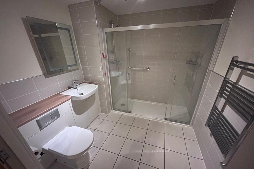 The bathroom is fully tiled and fitted with large walk-in shower, WC, vanity unit, sink and mirror above.
