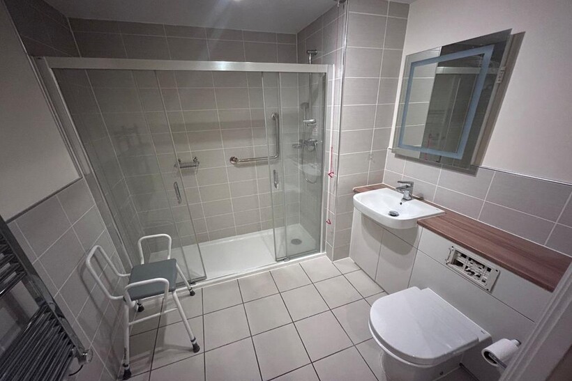 The bathroom is fully tiled and fitted with large walk-in shower, WC, vanity unit, sink and mirror above.