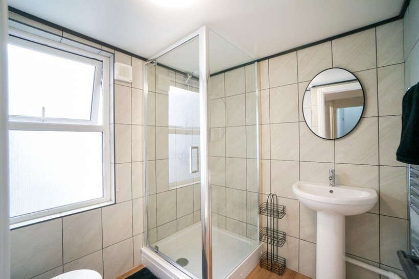 The standout feature of this home is its bright and spacious living room, complete with comfy leather sofas, a coffee table, and stylish lighting – ideal for relaxing or entertaining after a busy day. The separate kitchen is fully equipped with two ovens and hobs, making cooking for a full house simple and efficient.