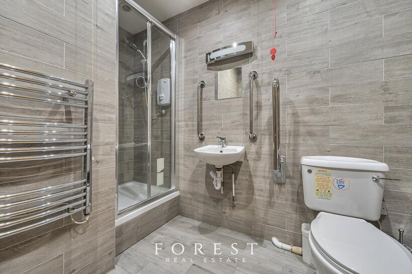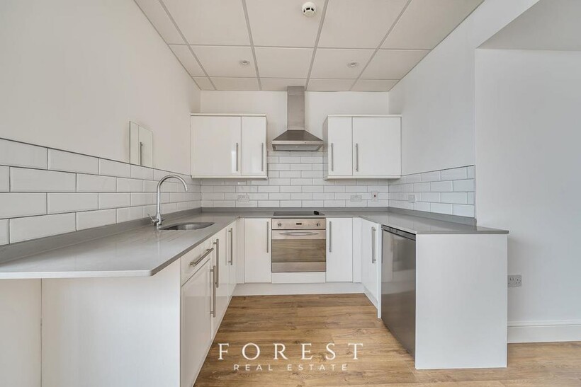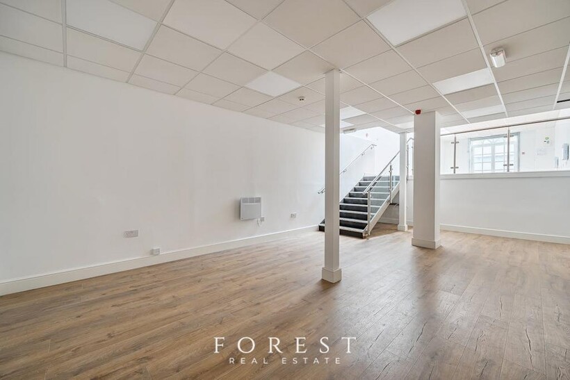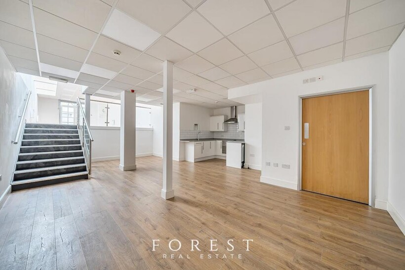 The premises feature a modern fitted kitchen with laminate worktops and ample storage units, as well as a contemporary shower room and WC. Additional amenities include a secure entrance with security shutters, laminate flooring, suspended ceilings, modern lighting, and skylights that provide excellent natural light throughout.