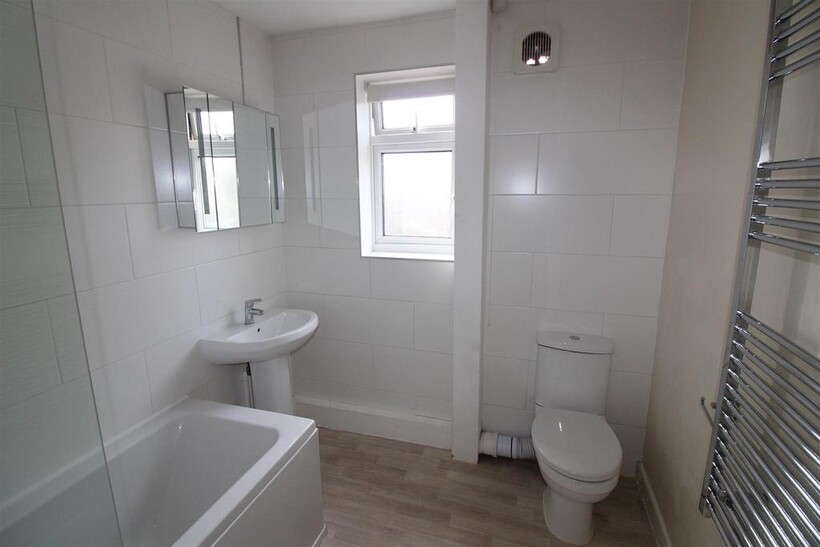Bathroom - 2.46 x 2.08 (8'0" x 6'9") - 8' 1" x 6' 10" (2.46m x 2.08m) Brand new white suite comprising panelled bath with electric shower fitment over, low level WC and pedestal wash hand basin. Complementary tiling. Extractor fan. Electric wall heater. Heated towel rail. Vinyl flooring. Opaque double glazed window.