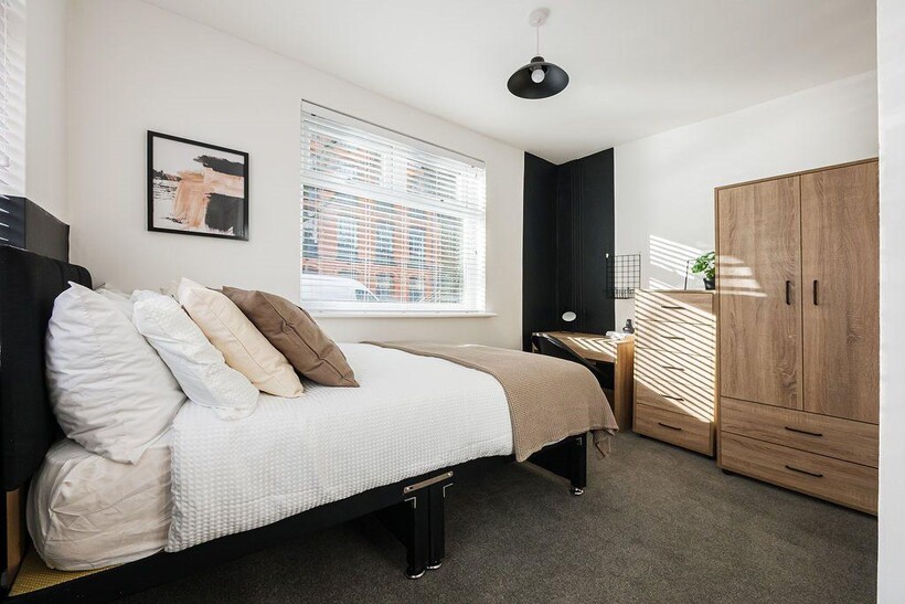 Recently renovated with bespoke design throughout, this stylish 6-bedroom student property features 5 modern bathrooms for maximum convenience. The shared living space and kitchen come fully furnished and equipped with appliances. All bedrooms are beautifully designed with a modern touch and are furnished with double beds, a desk, bedside table and wardrobe. 4 of the bedrooms have en-suites and 2 rooms share a bathroom.