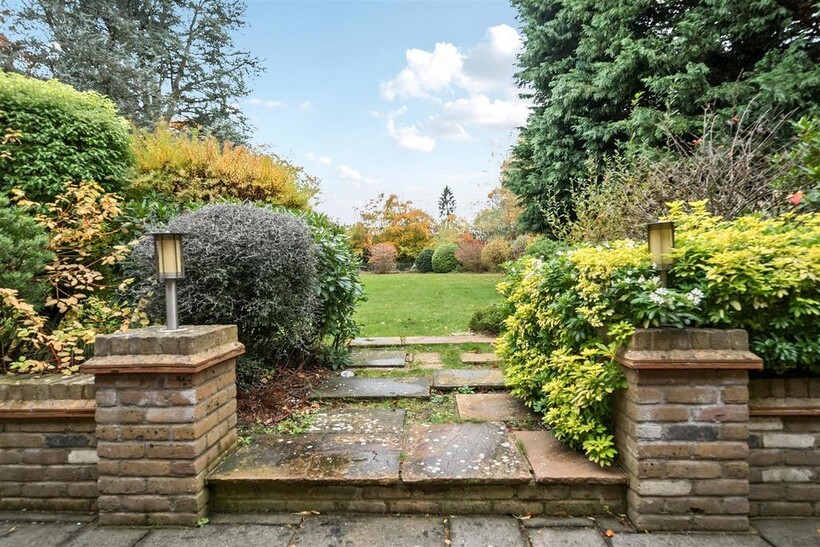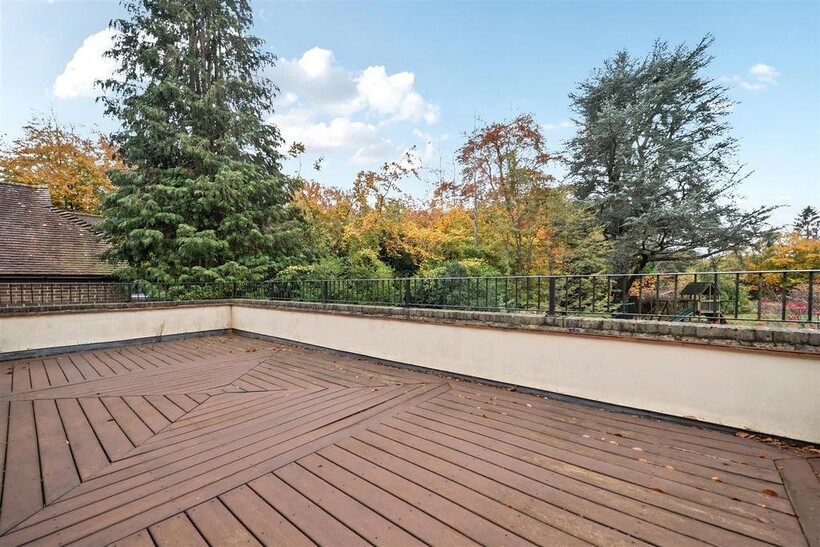 To the rear, a large terrace spans the width of the property, offering the perfect setting for outdoor entertaining. Beyond lies an extensive lawn surrounded by mature trees and shrubs, with a tennis court positioned at the far end of the garden. The property’s secluded setting ensures complete privacy and tranquility throughout.