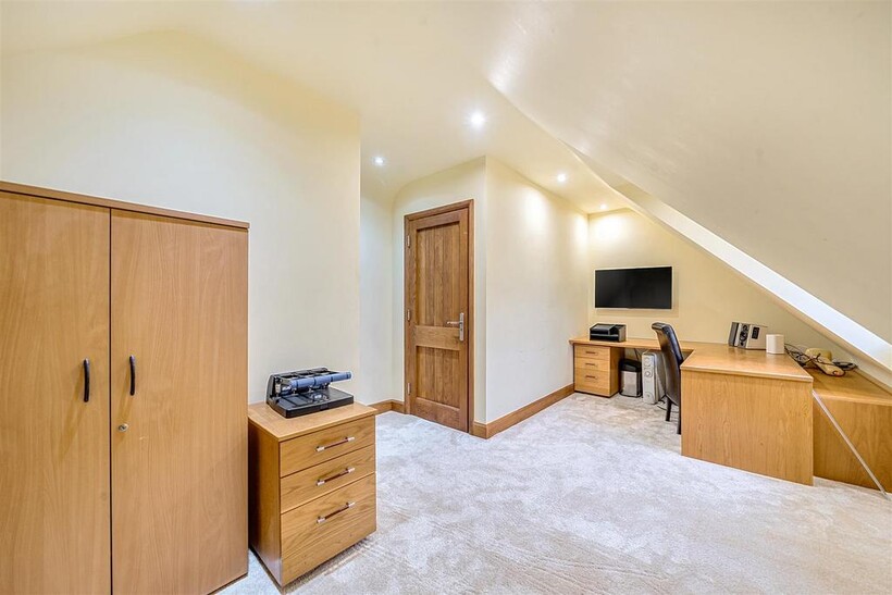 The first floor features a superb principal bedroom suite with an en-suite bathroom, French doors leading onto a private balcony, and stairs rising to a dressing room. There are four additional double bedrooms, all with fitted wardrobes; two benefit from en-suite bath/shower rooms, while the remaining rooms are served by a well-appointed family bathroom. The top floor provides two further double bedrooms, each with en-suite bath/shower rooms, as well as ample eaves storage.