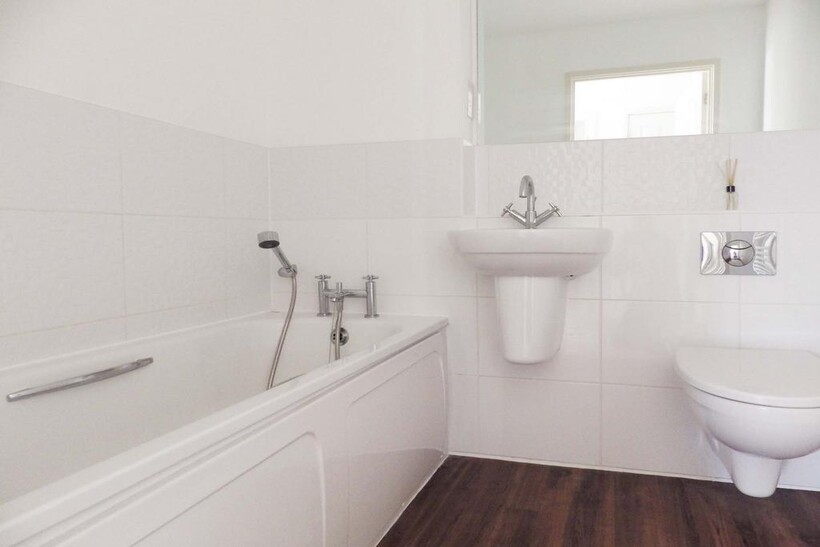 The bathroom has a matching white suite with tile surround.