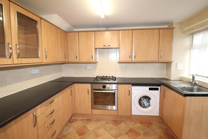 Kitchen - 2.67 x 3.12 (8'9" x 10'2") - With UPVC double glazed window to rear aspect, obscure glazed panel door leading to the garden. Kitchen with a range of wall and base units with roll top work surfaces, inset stainless steel sink and drainage unit, built in electric oven with four ring gas hob, and extractor hood, integrated washer/dryer, panel radiator.