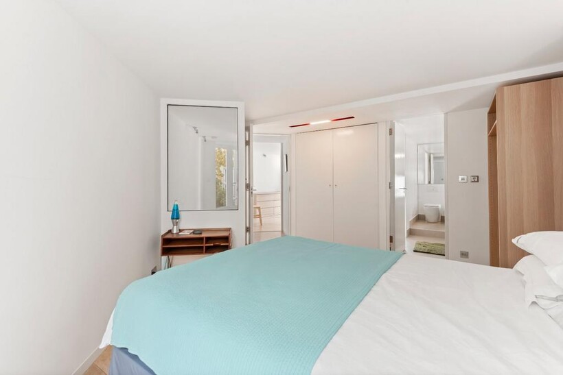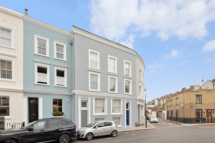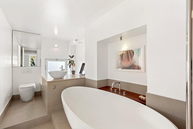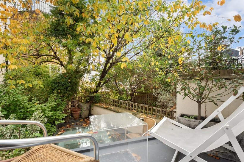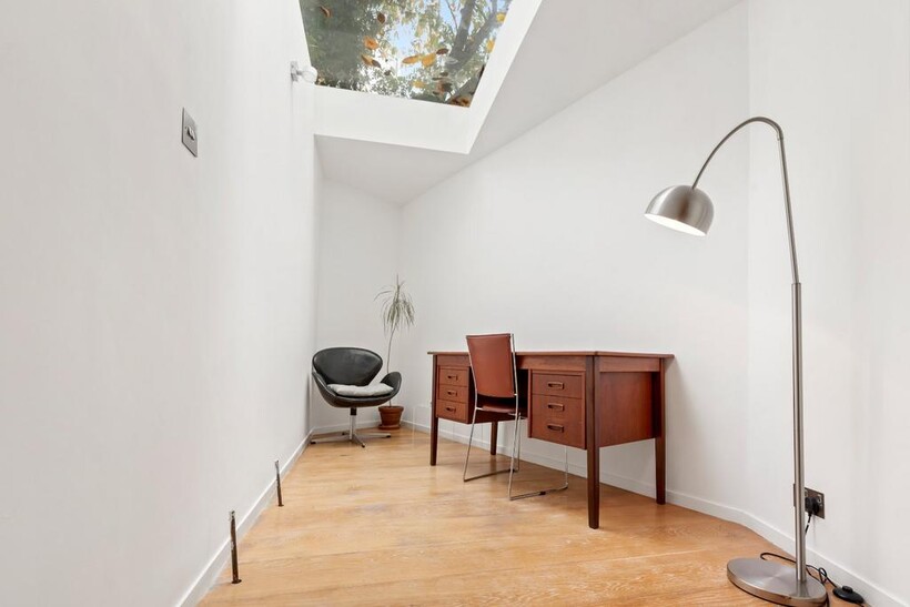 Upstairs, two bedrooms continue the home's refined and tranquil style. The principal bedroom opens onto a flat roof terrace, ideal for outdoor relaxation, while the second bedroom benefits from large sash windows. The bathroom features a sculptural freestanding bath set against marble tiling, with an additional shower room located on the lower ground floor.