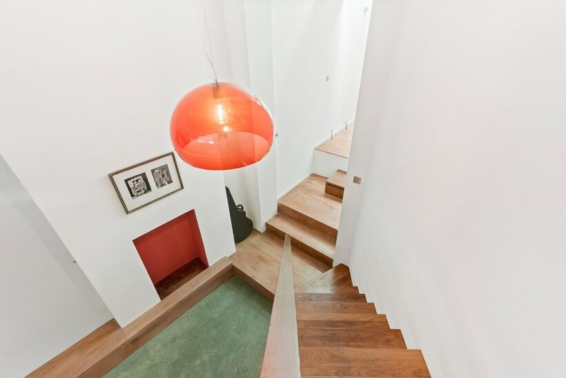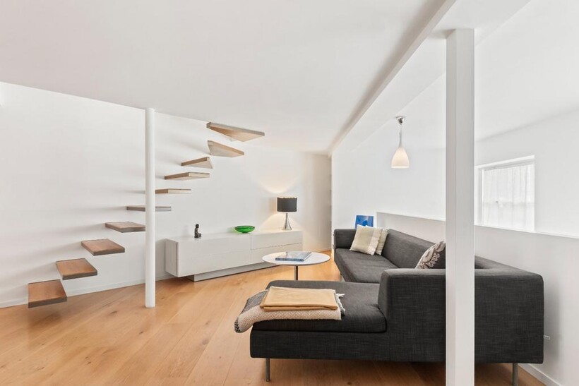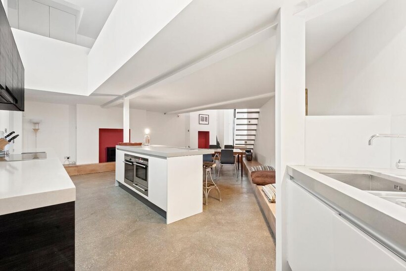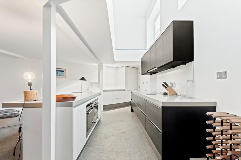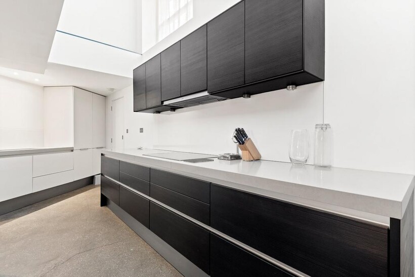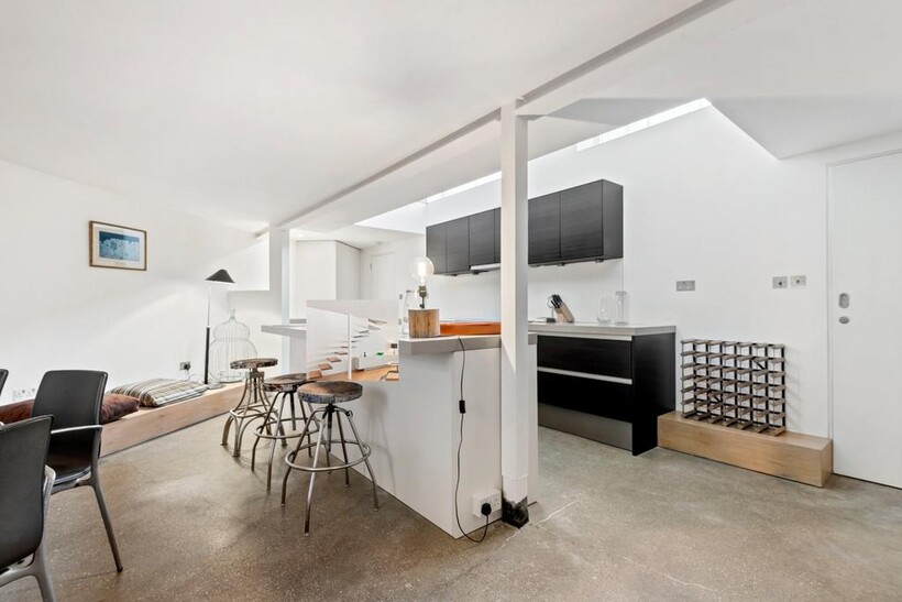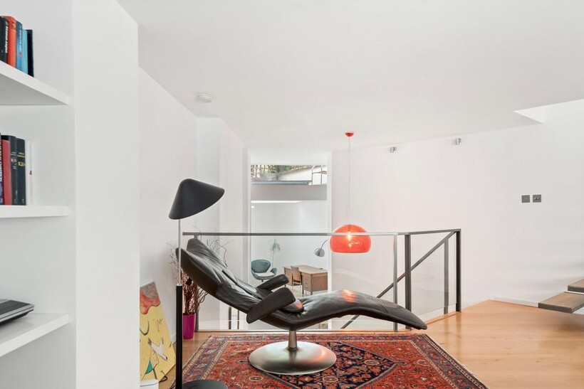 Short Let - Positioned on a quiet corner of Penzance Place, this two-bedroom home combines modern design with a calm, light-filled interior. Pale timber floors and white walls create a bright, understated backdrop for mid-century furnishings and textured details.The entrance opens into a spacious reception room with a minimalist aesthetic and warm natural tones. A glass-panelled cantilevered staircase leads down to the open-plan kitchen and dining area, where stone flooring and dark cabinetry add a contemporary edge. A raised study area, positioned beneath a glazed ceiling, draws in plenty of natural light.