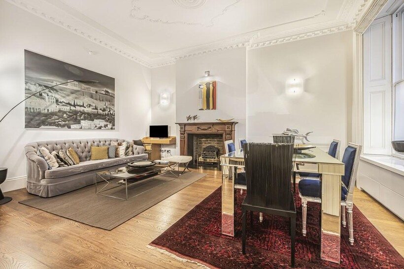 Beautifully presented two-bedroom, two-bathroom ground-floor apartment with private entrance, ideally located in South Kensington. This stylish home features a bright reception room with high ceilings, feature fireplace, and a dining area for six.Both double bedrooms have en-suite bathrooms, with the principal suite offering built-in storage, a freestanding bath, steam shower, and built-in TV. The modern kitchen is fully fitted with integrated appliances, plus a utility cupboard and guest WC.
