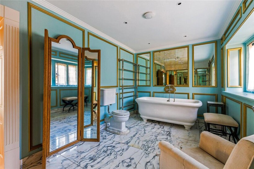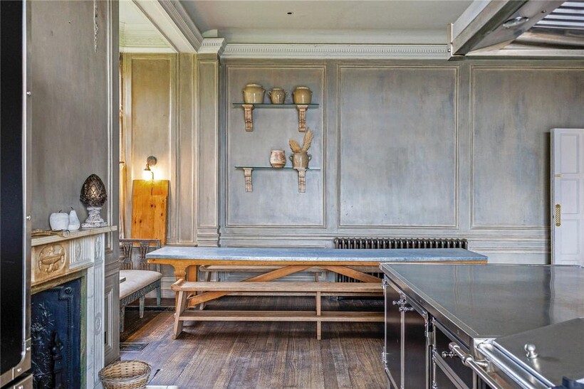 The accommodation is beautifully proportioned throughout. The welcoming reception hall provides an immediate sense of space and grandeur. To the front of the house lies a magnificent ballroom, an exceptional entertaining space with a high ceiling, bay windows and an open fireplace, flooding the room with natural light. Adjacent is a further reception room, ideal as a study, snug or informal sitting room. At the heart of the home is a bespoke, state-of-the-art kitchen, fitted with custom cabinetry, twin gas ovens and a generous dining and seating area, perfectly designed for modern family living.