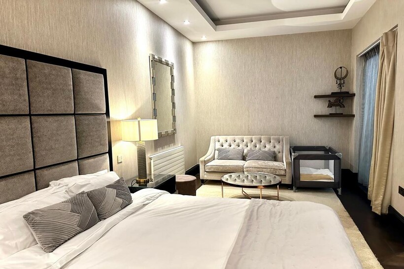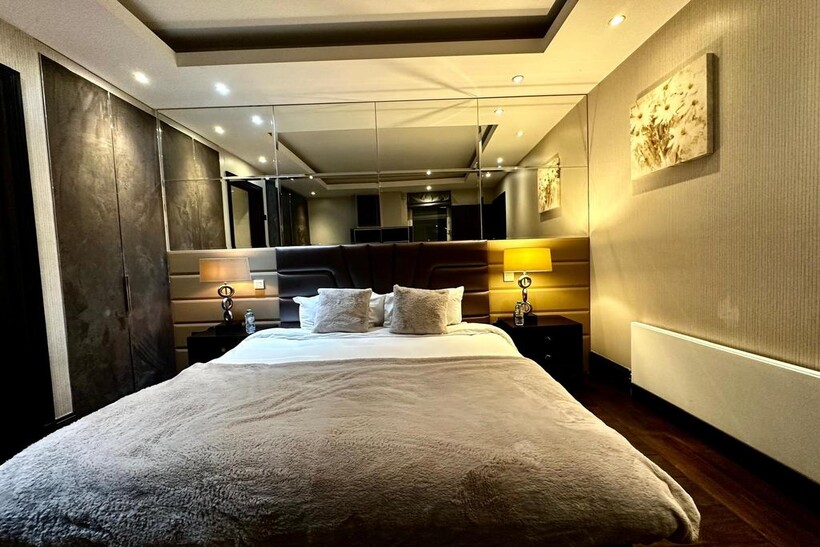 The lower level hosts four luxurious bedroom suites, each with its own en-suite bathroom, along with a private indoor swimming pool, gym, lift access, and ample storage. Every detail reflects understated elegance and modern convenience.