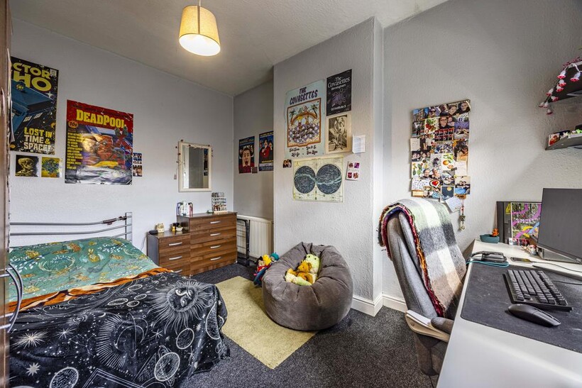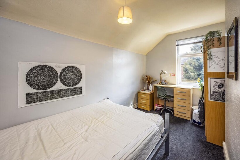 Four double bedrooms each come fully furnished with a desk, drawers, and wardrobe, offering plenty of space and natural light.